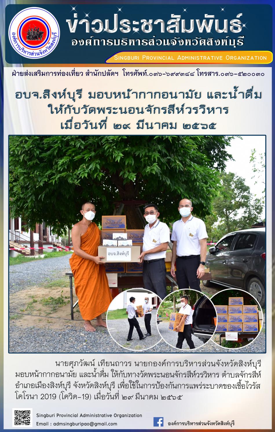 อบจ.สิงห์บุรี มอบหน้ากากอนามัย และน้ำดื่มให้กับวัดพระนอนจักรสีห์วรวิหาร [29 มีนาคม 2565]