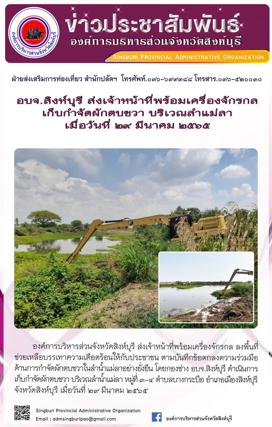 อบจ.สิงห์บุรี ส่งเจ้าหน้าที่พร้อมเครื่องจักรกล เก็บกำจัดผักตบชวา บริเวณลำแม่ลา [29 มีนาคม 2565]