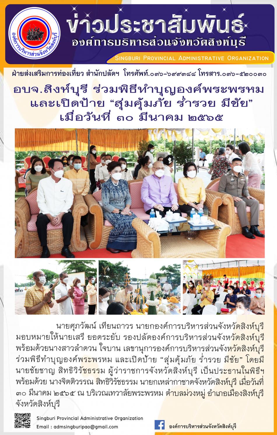 อบจ.สิงห์บุรี ร่วมพิธีทำบุญองค์พระพรหมและเปิดป้าย "สุ่มคุ้มภัย ร่ำรวย มีชัย" [30 มีนาคม 2565]