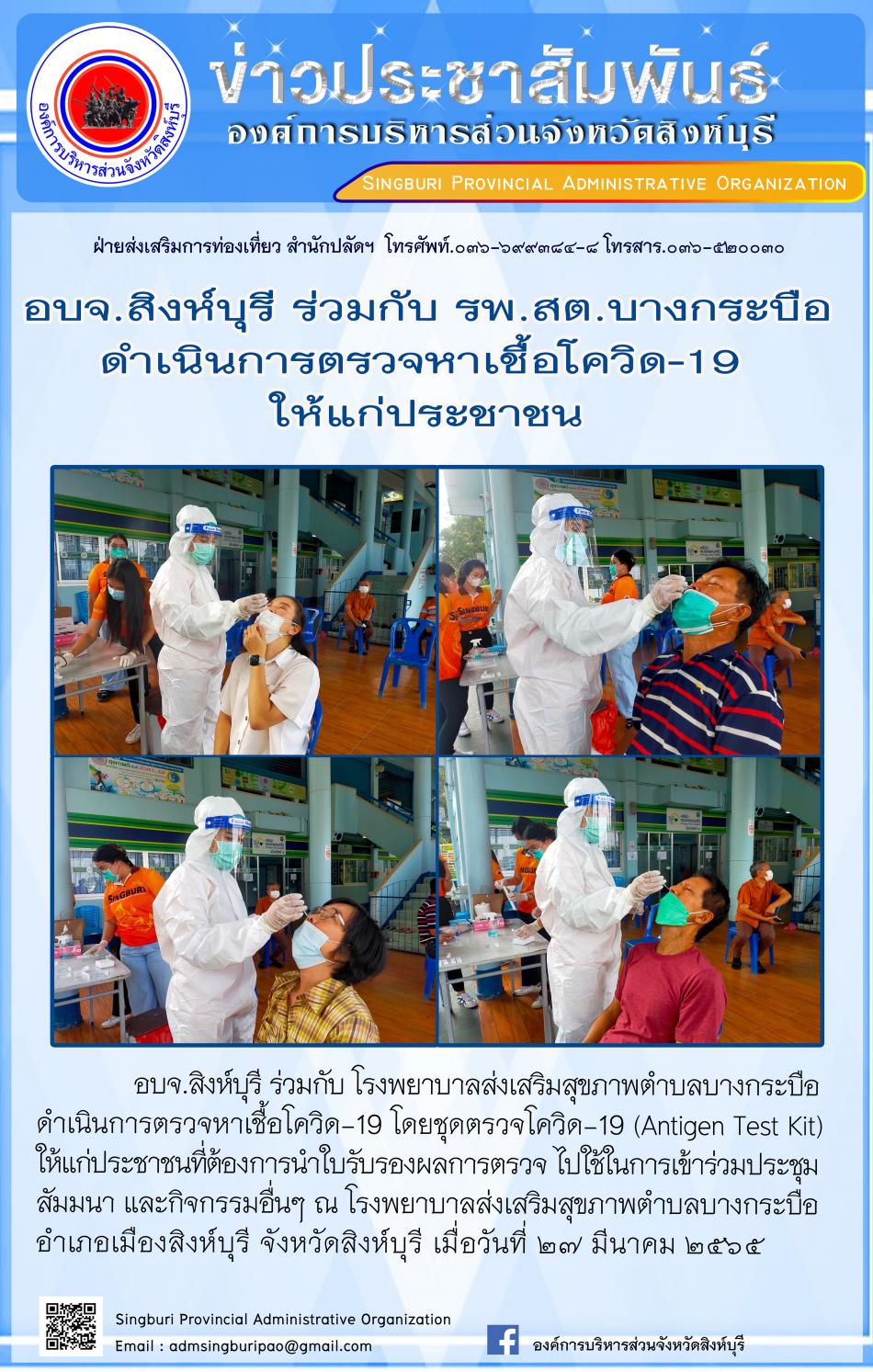 อบจ.สิงห์บุรี ร่วมกับ รพ.สต.บางกระบือ ดำเนินการตรวจหาเชื้อโควิด-19 ให้แก่ประชาชน [27 มีนาคม 2565]
