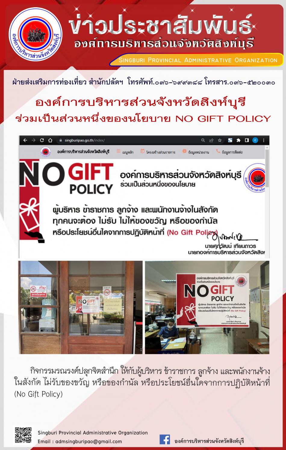 องค์การบริหารส่วนจังหวัดสิงห์บุรี ร่วมเป็นส่วนหนึ่งของนโยบาย No gift policy [24 มีนาคม 2565]