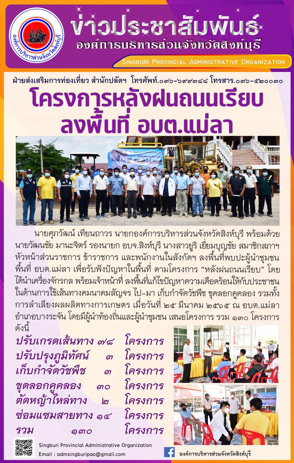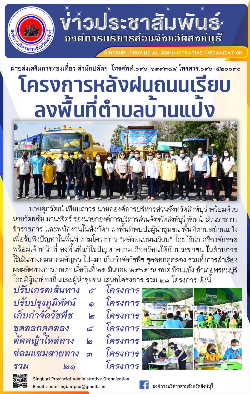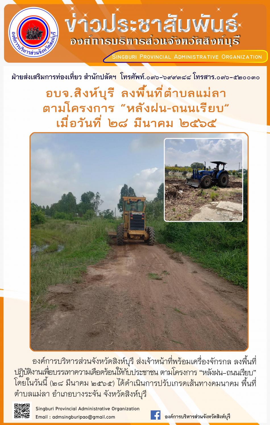 อบจ.สิงห์บุรี ลงพื้นที่ตามโครงการ "หลังฝนถนนเรียบ" [28 มีนาคม 2565]