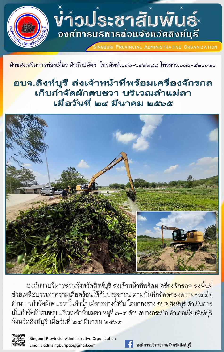 อบจ.สิงห์บุรี ส่งเจ้าหน้าที่พร้อมเครื่องจักรกล เก็บกำจัดผักตบชวา บริเวณลำแม่ลา [24 มีนาคม 2565]