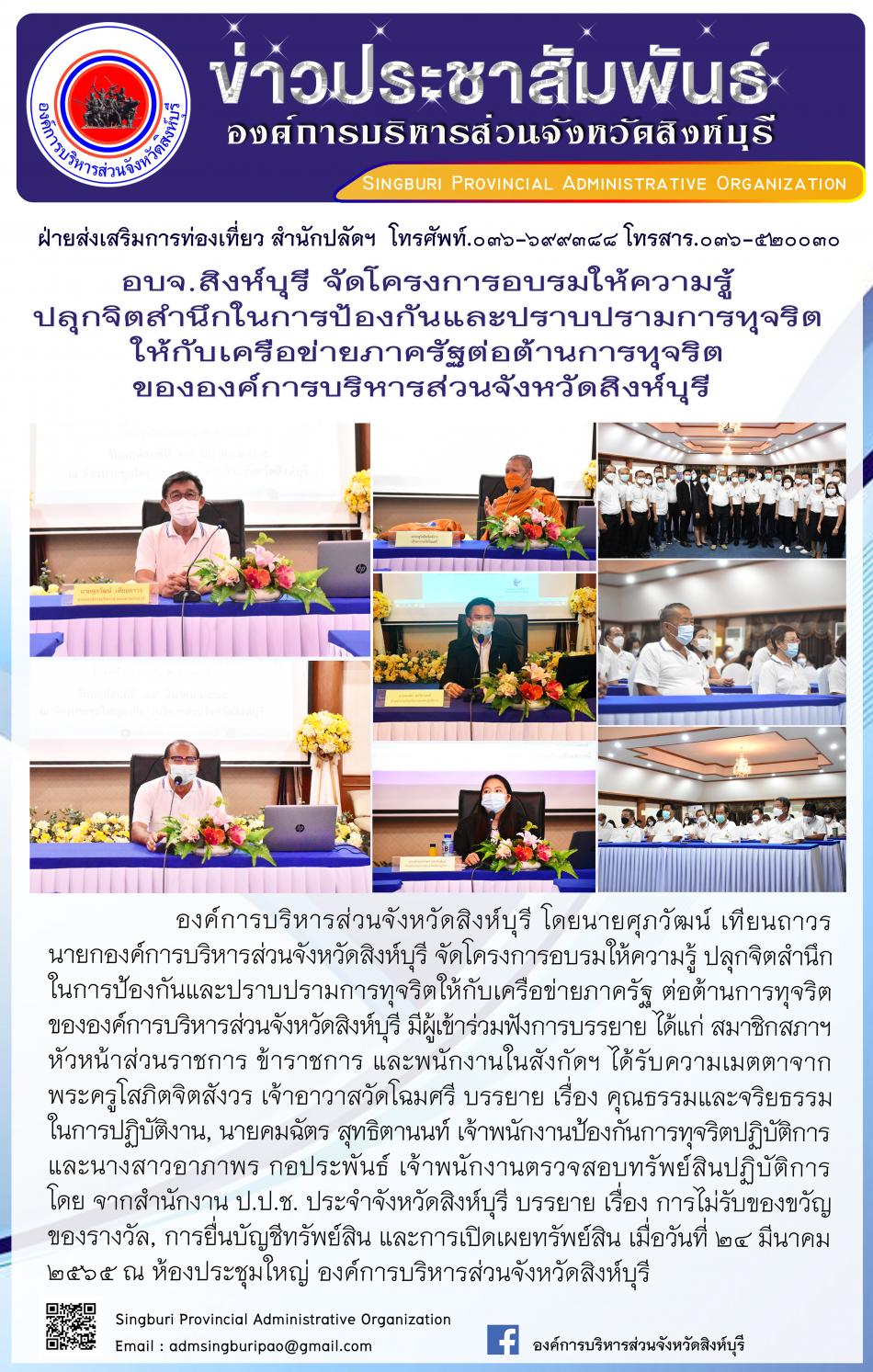 อบจ.สิงห์บุรี จัดโครงการอบรมให้ความรู้ ปลุกจิตสำนึกในการป้องกันและปราบปรามการทุจริตให้กับเครือข่ายภาครัฐต่อต้านการทุจริตขององค์การบริหารส่วนจังหวัดสิงห์บุรี [24 มีนาคม 2565]