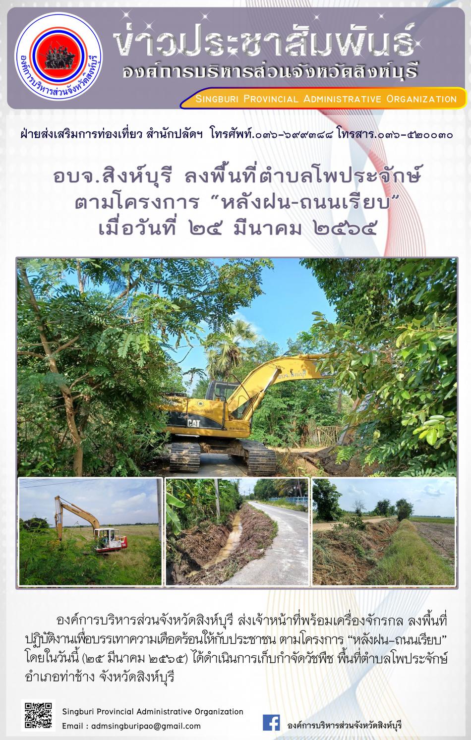 อบจ.สิงห์บุรี ลงพื้นที่ตำบลโพประจักษ์ ตามโครงการ "หลังฝนถนนเรียบ" [25 มีนาคม 2565]