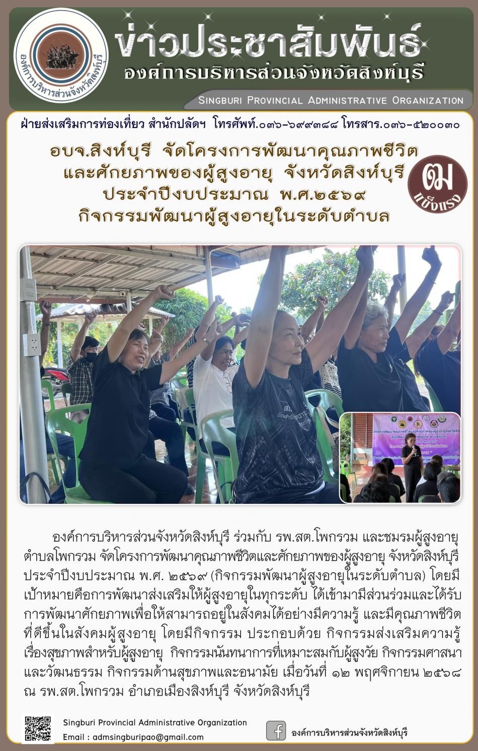 อบจ. สิงห์บุรี จัดโครงการพัฒนาคุณภาพชีวิตและศักยภาพของผู้สูงอายุ จังหวัด สิงห์บุรี ประจำประจำปีงบประมาณปี พ. ศ. 2569 กิจกรรมพัฒนาผู้สูงอายุในระดับตำบลกิจกรรมพัฒนาผู้สูงอายุในระดับตำบล [12 พฤศจิกายน 2568]