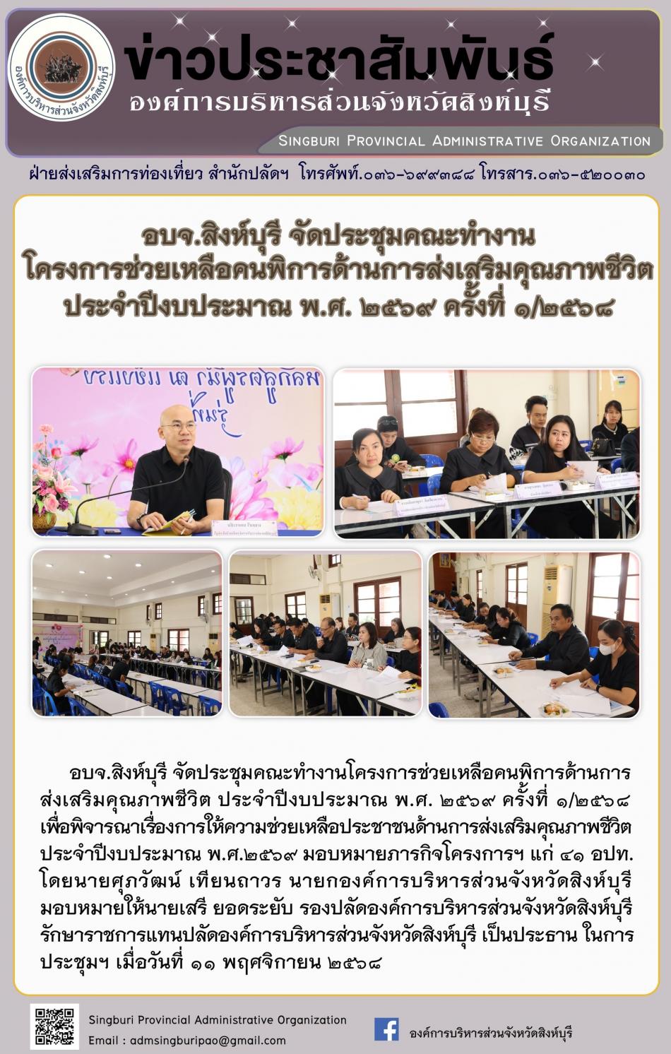 อบจ.สิงห์บุรี จัดประชุมคณะทำงานโครงการช่วยเหลือคนพิการด้านการส่งเสริมคุณภาพชีวิต ประจำปีงบประมาณพ.ศ. 2569 ครั้งที่1/ 2568 [11 พฤศจิกายน 2568]