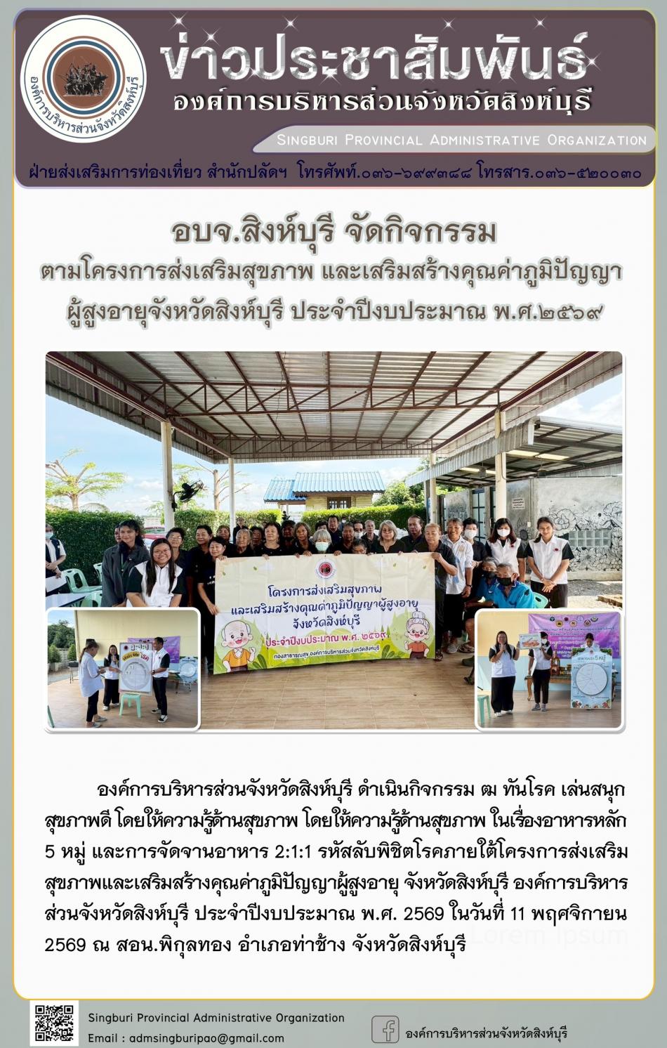 อบจ.สิงห์บุรี จัดกิจกรรมตามโครงการส่งเสริมสุขภาพ และเสริมสร้างคุณค่าภูมิปัญญา ผู้สูงอายุจังหวัดสิงห์บุรี ประจำปีงบประมาณ พ.ศ. 2569 [11 พฤศจิกายน 2568]