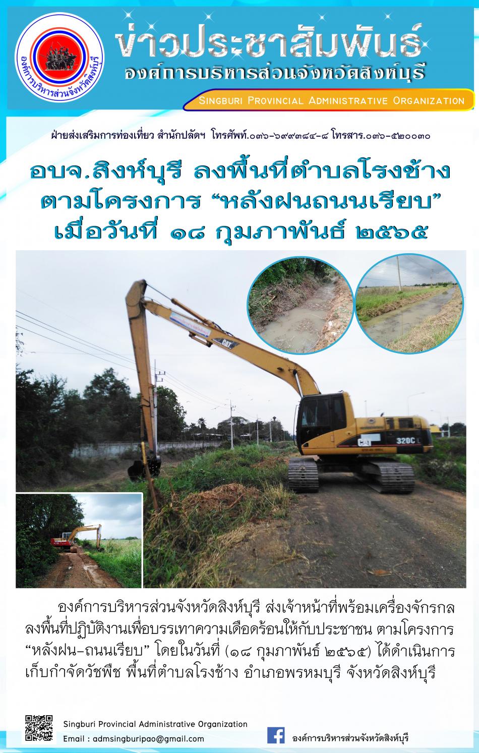 อบจ.สิงห์บุรี ลงพื้นที่ตำบลโรงช้าง ตามโครงการ "หลังฝนถนนเรียบ" [18 กุมภาพันธ์ 2565]