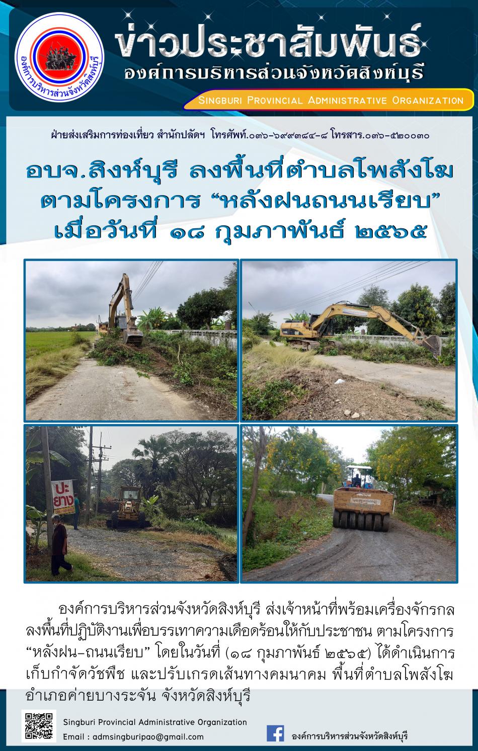 อบจ.สิงห์บุรี ลงพื้นที่ตำบลโพสังโฆ ตามโครงการ "หลังฝนถนนเรียบ" [18 กุมภาพันธ์ 2565]