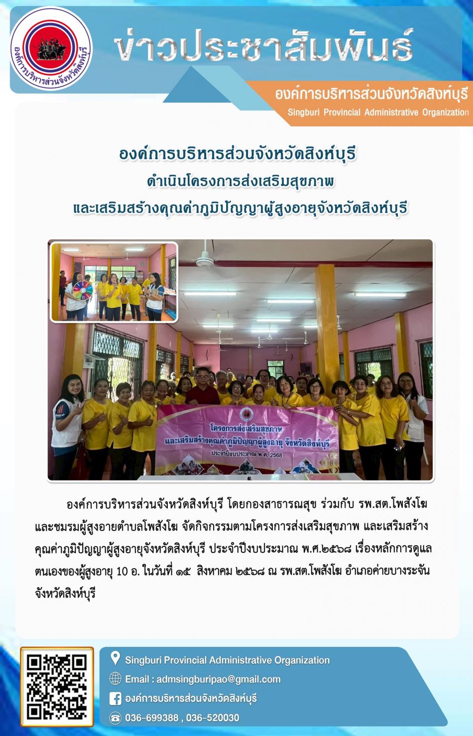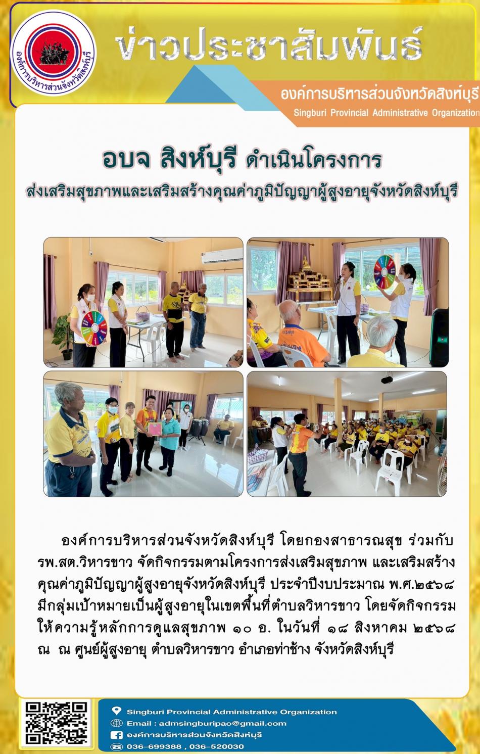 องค์การบริหารส่วนจังหวัดสิงห์บุรี ดำเนินโครงการส่งเสริมสุขภาพ และเสริมสร้างคุณค่าภูมิปัญญาผู้สูงอายุจังหวัดสิงห์บุรี [15 สิงหาคม 2568]