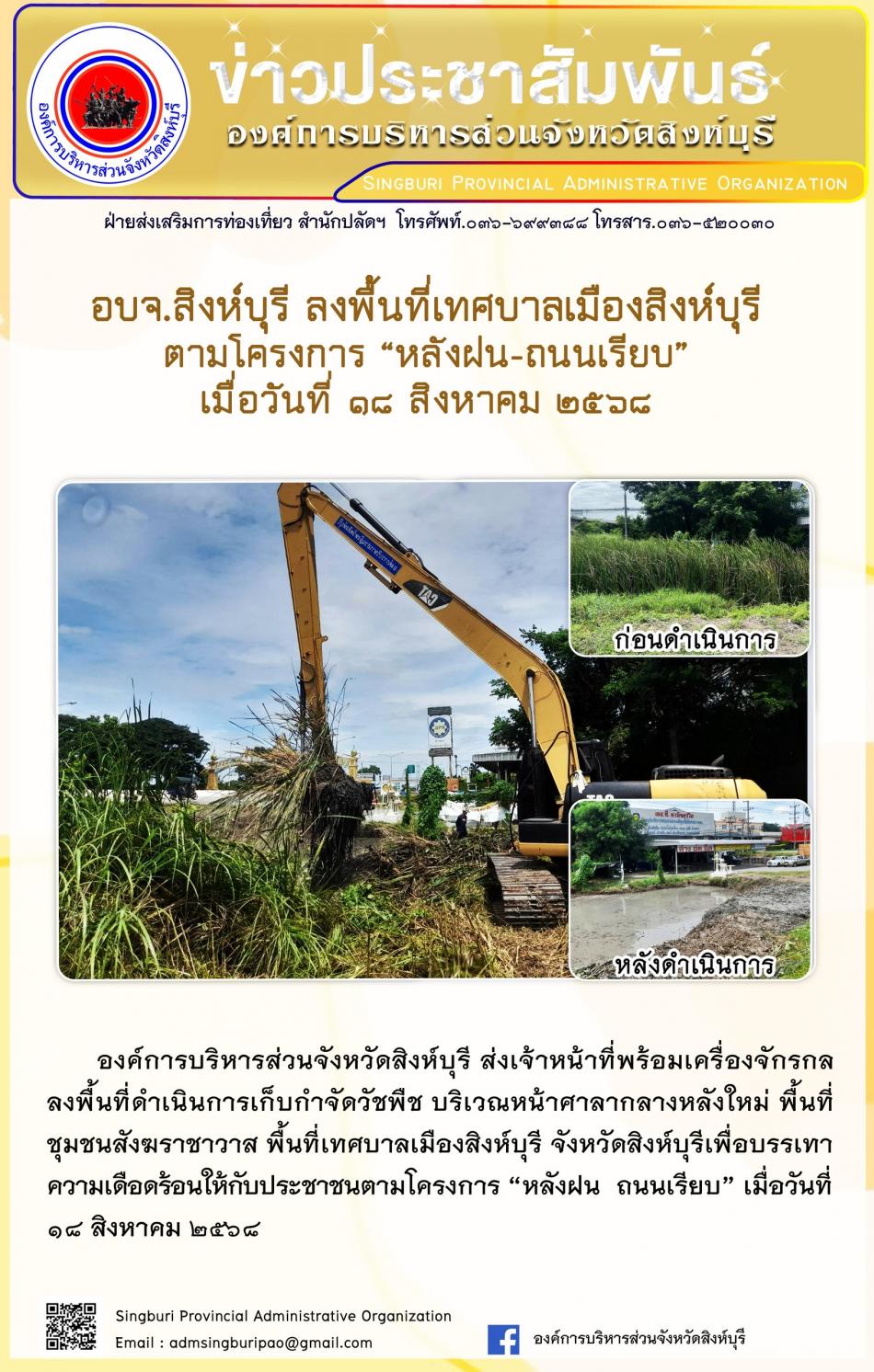 อบจ. สิงห์บุรี ลงพื้นที่ เทศบาลเมืองสิงห์บุรี ตามโครงการ “ หลังฝน-ถนนเรียบ”ลงพื้นที่ [18 สิงหาคม 2568]