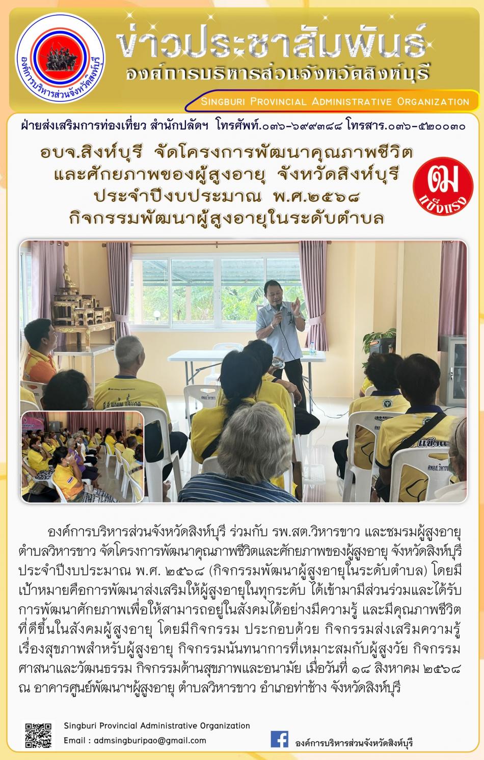 อบจ. สิงห์บุรี จัดโครงการพัฒนาคุณภาพชีวิตและศักยภาพของผู้สูงอายุ จังหวัด สิงห์บุรี ประจำประจำปีงบประมาณปี พ. ศ. 2568 กิจกรรมพัฒนาผู้สูงอายุในระดับตำบลกิจกรรมพัฒนาผู้สูงอายุในระดับตำบล [18 สิงหาคม 2568]