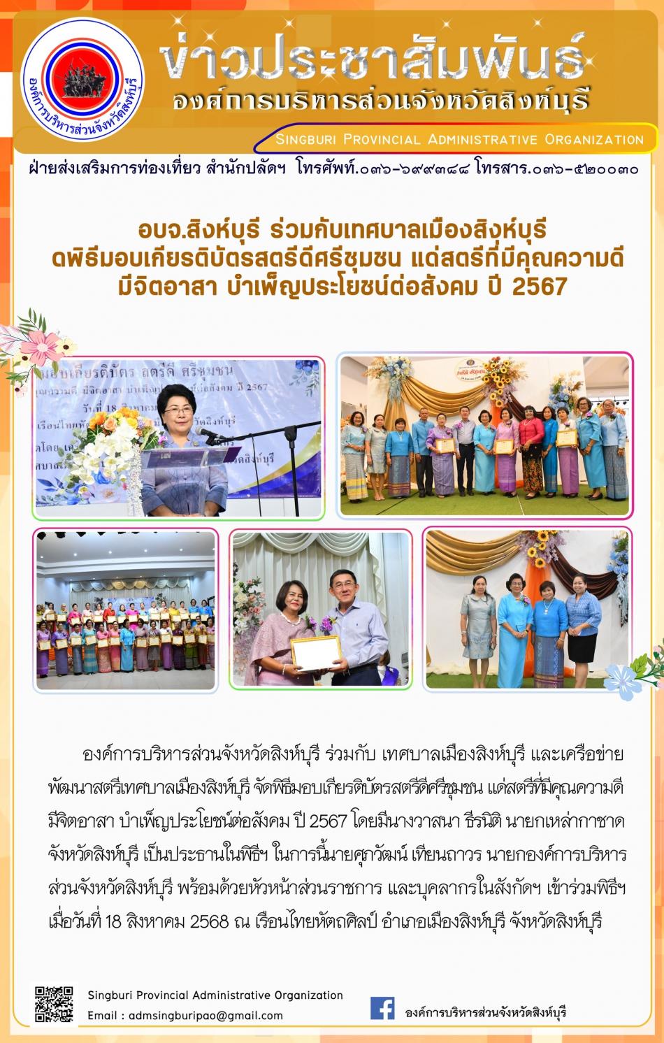 อบจ. สิงห์บุรี ร่วมกับเทศบาลเมืองสิงห์บุรี จัดพิธีมอบเกียรติติบัตรสตรี แด่สตรีที่มีความ มีจิต บำบำเพ็ญประโยชน์ ปี 2567 [18 สิงหาคม 2568]