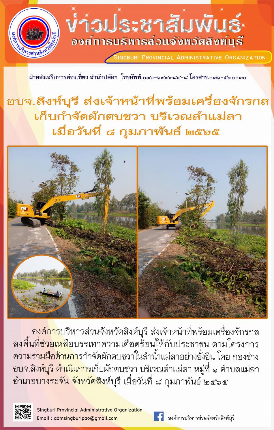 อบจ.สิงห์บุรี ส่งเจ้าหน้าที่พร้อมเครื่องจักรกล เก็บกำจัดผักตบชวา บริเวณลำแม่ลา [8 กุมภาพันธ์ 2565]
