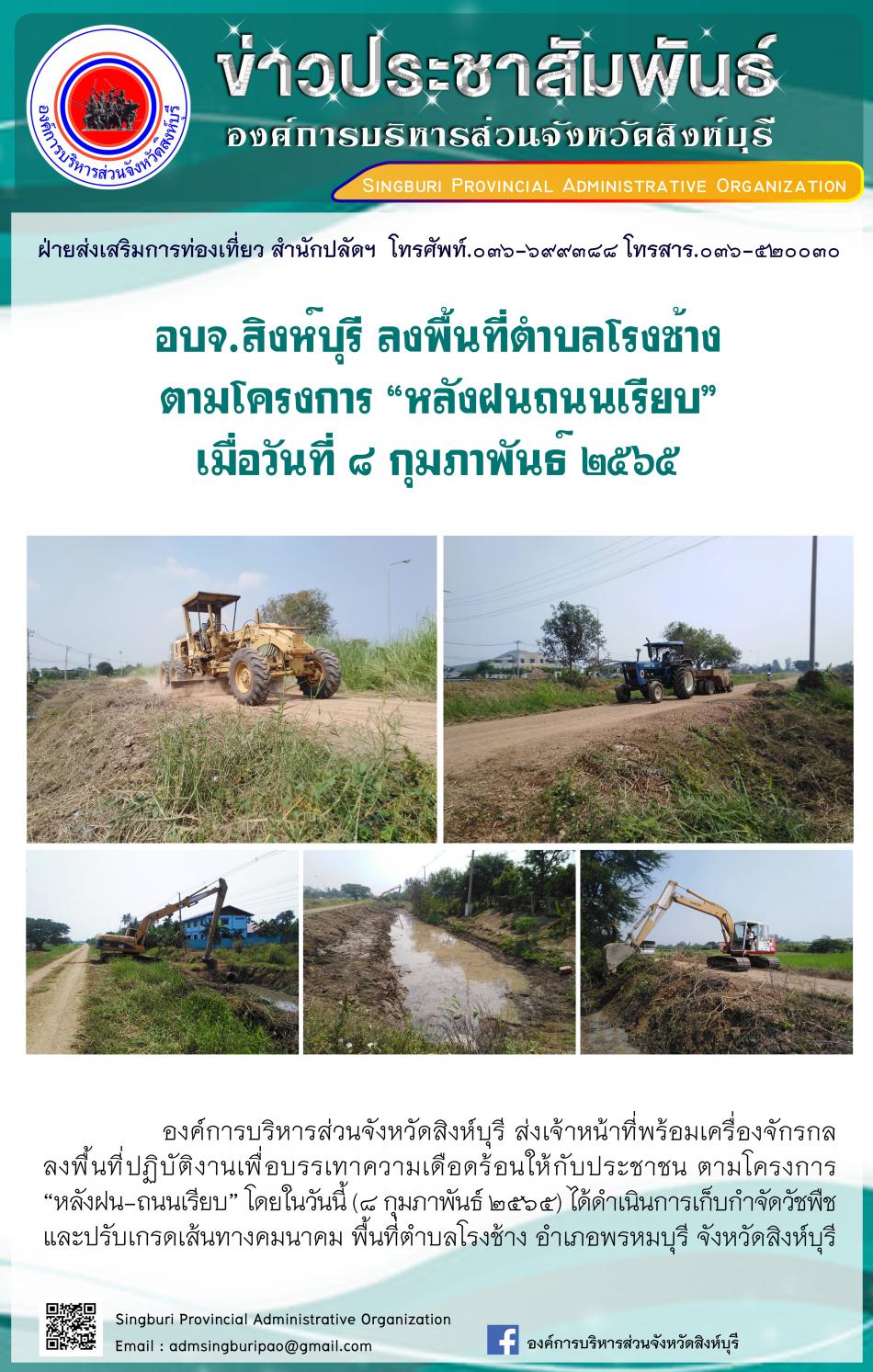 อบจ.สิงห์บุรี ลงพื้นที่ตำบลโรงช้าง ตามโครงการ "หลังฝนถนนเรียบ" [8 กุมภาพันธ์ 2565]