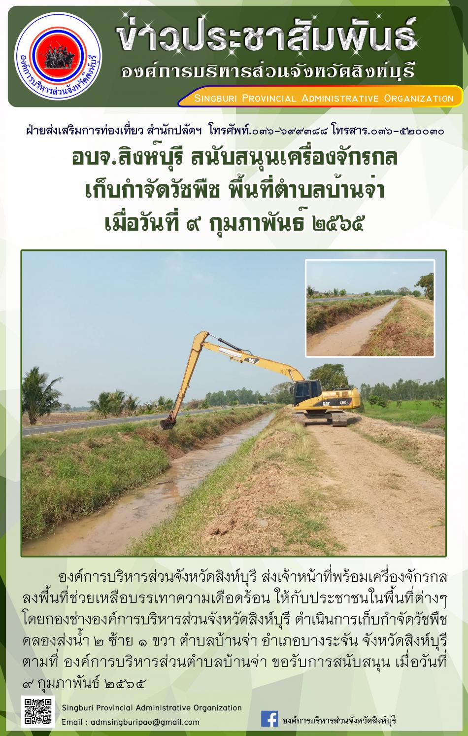 อบจ.สิงห์บุรี สนับสนุนเครื่องจักรกล เก็บกำจัดวัชพืช พื้นที่ตำบลบ้านจ่า [9 กุมภาพันธ์ 2565]
