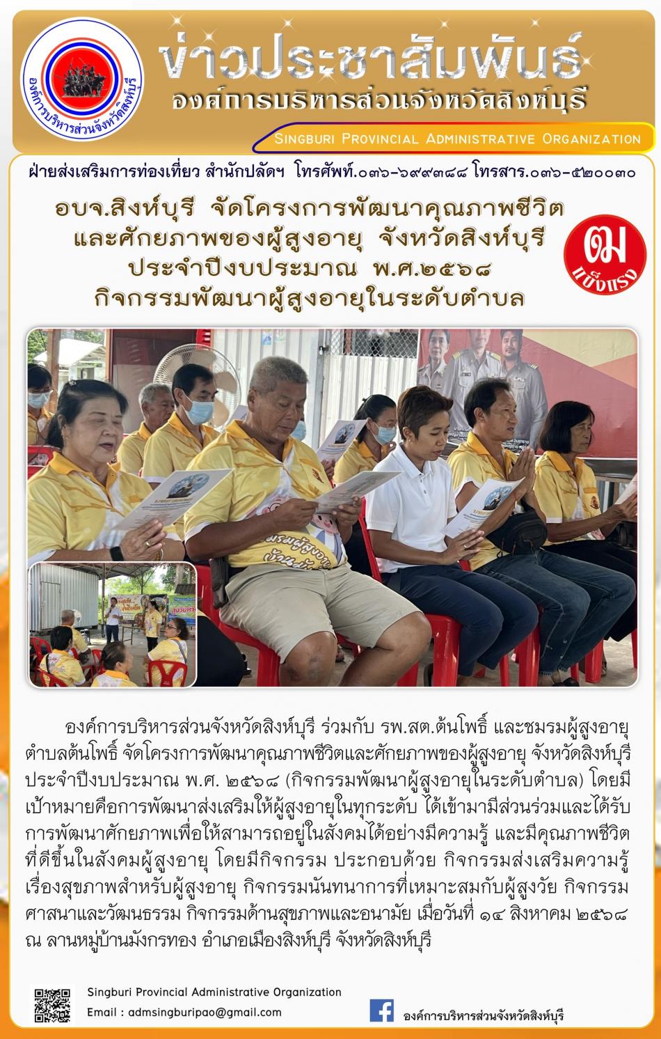 อบจ. สิงห์บุรี จัดโครงการพัฒนาคุณภาพชีวิตและศักยภาพของผู้สูงอายุ จังหวัด สิงห์บุรี ประจำประจำปีงบประมาณปี พ. ศ. 2568 กิจกรรมพัฒนาผู้สูงอายุในระดับตำบลกิจกรรมพัฒนาผู้สูงอายุในระดับตำบล [14 สิงหาคม 2568]
