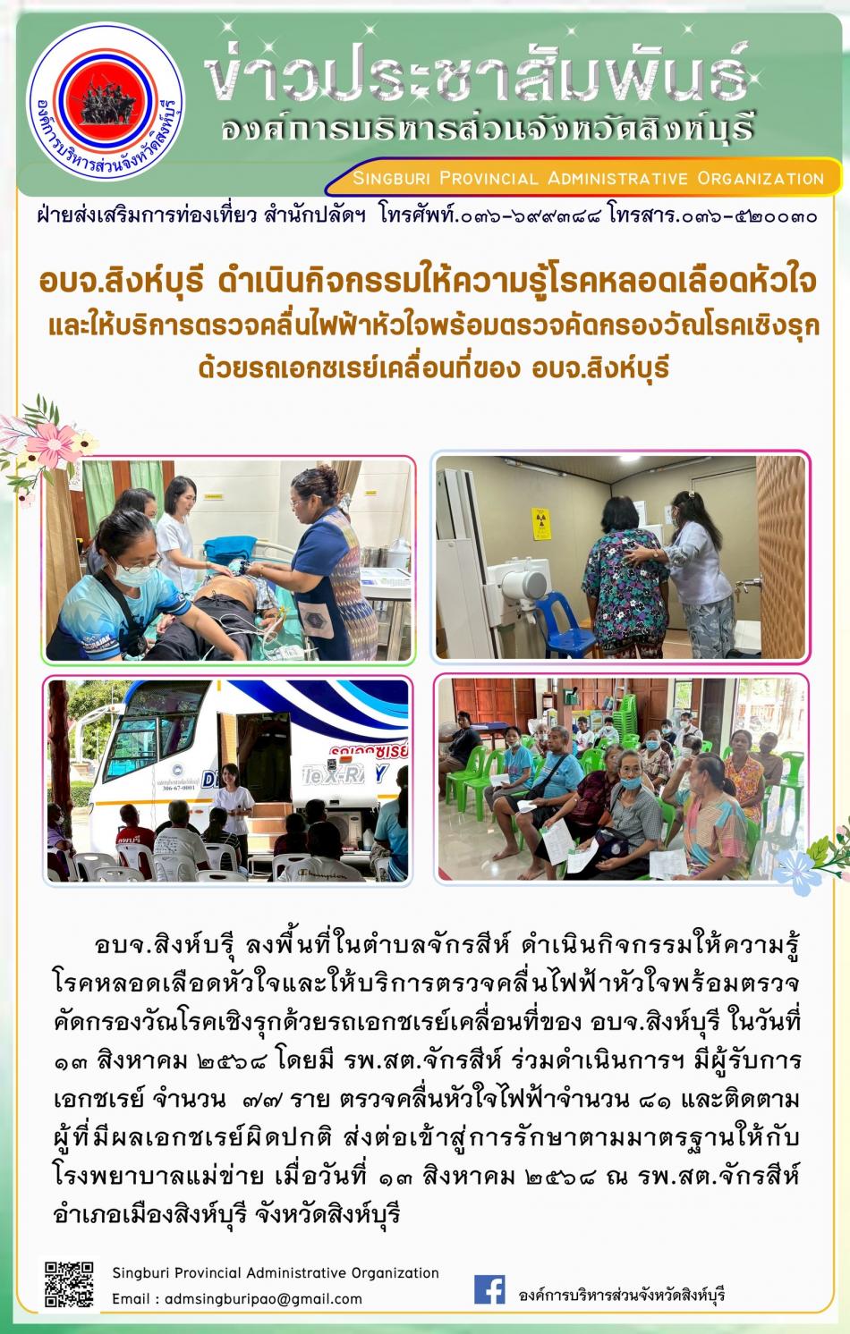 อบจ. สิงห์บุรี เดียวเนินกิจกรรมให้ความรู้โรคหลอดเลือดหัวใจและให้บริการ ตรวจคลื่นไฟฟ้าหัวใจตรวจคัดกรองวัณโรค เชิงรุกด้วยเครื่องเอ็กซเรย์เคลื่อนที่ของ อบจ. สิงห์บุรี [13 สิงหาคม 2568]