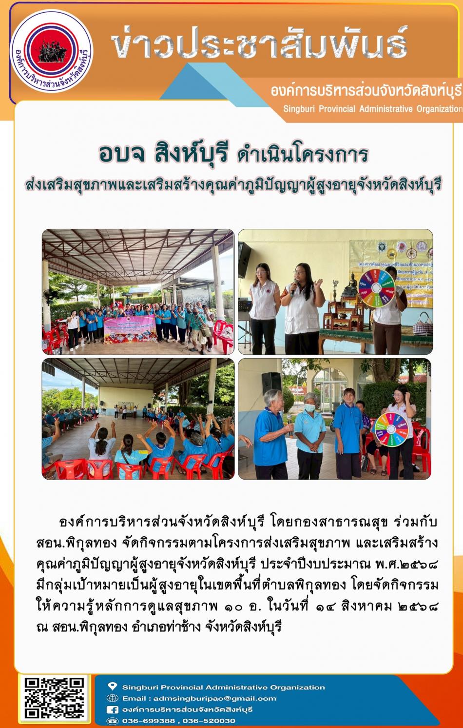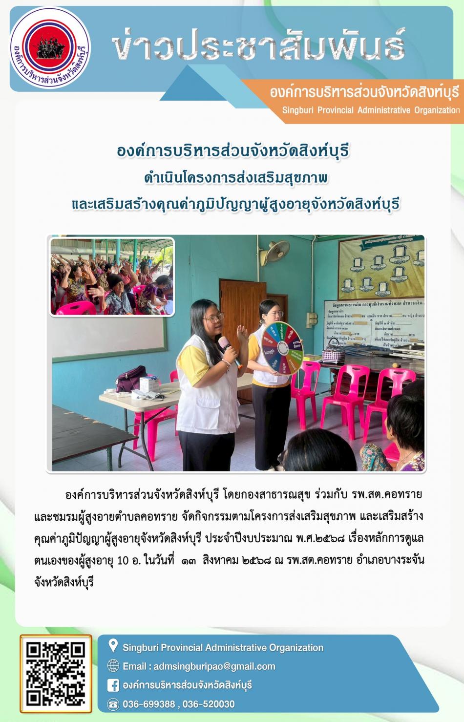 องค์การบริหารส่วนจังหวัดสิงห์บุรี ดำเดำเนินโครงการส่งเสริมสุขภาพและเสริมสร้างคุณค่าผู้สูงอายุจังหวัดสิงห์บุรี [13 สิงหาคม 2568]