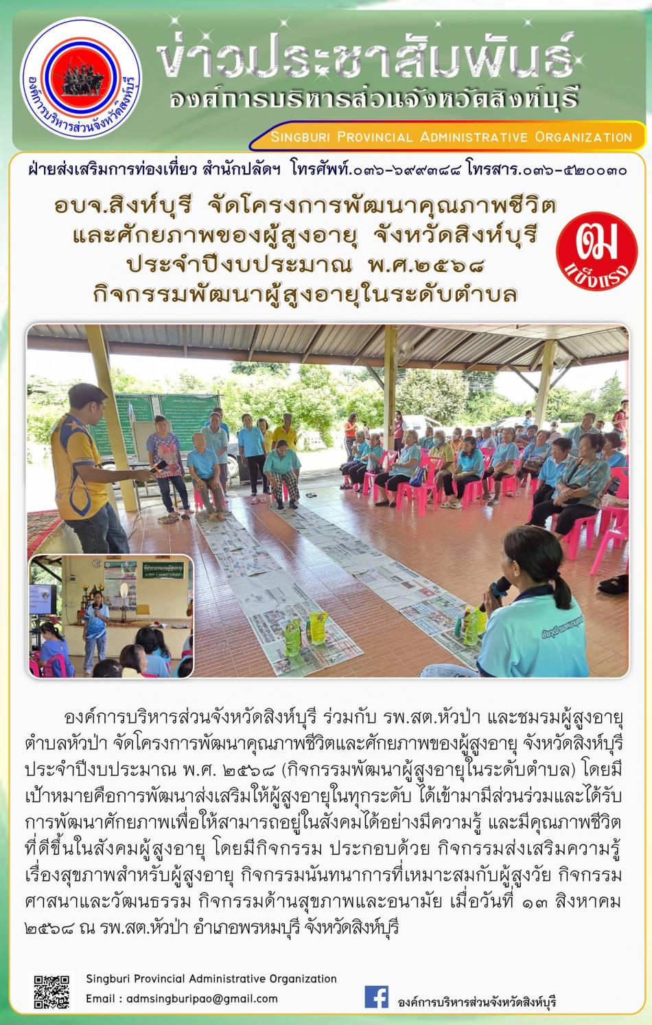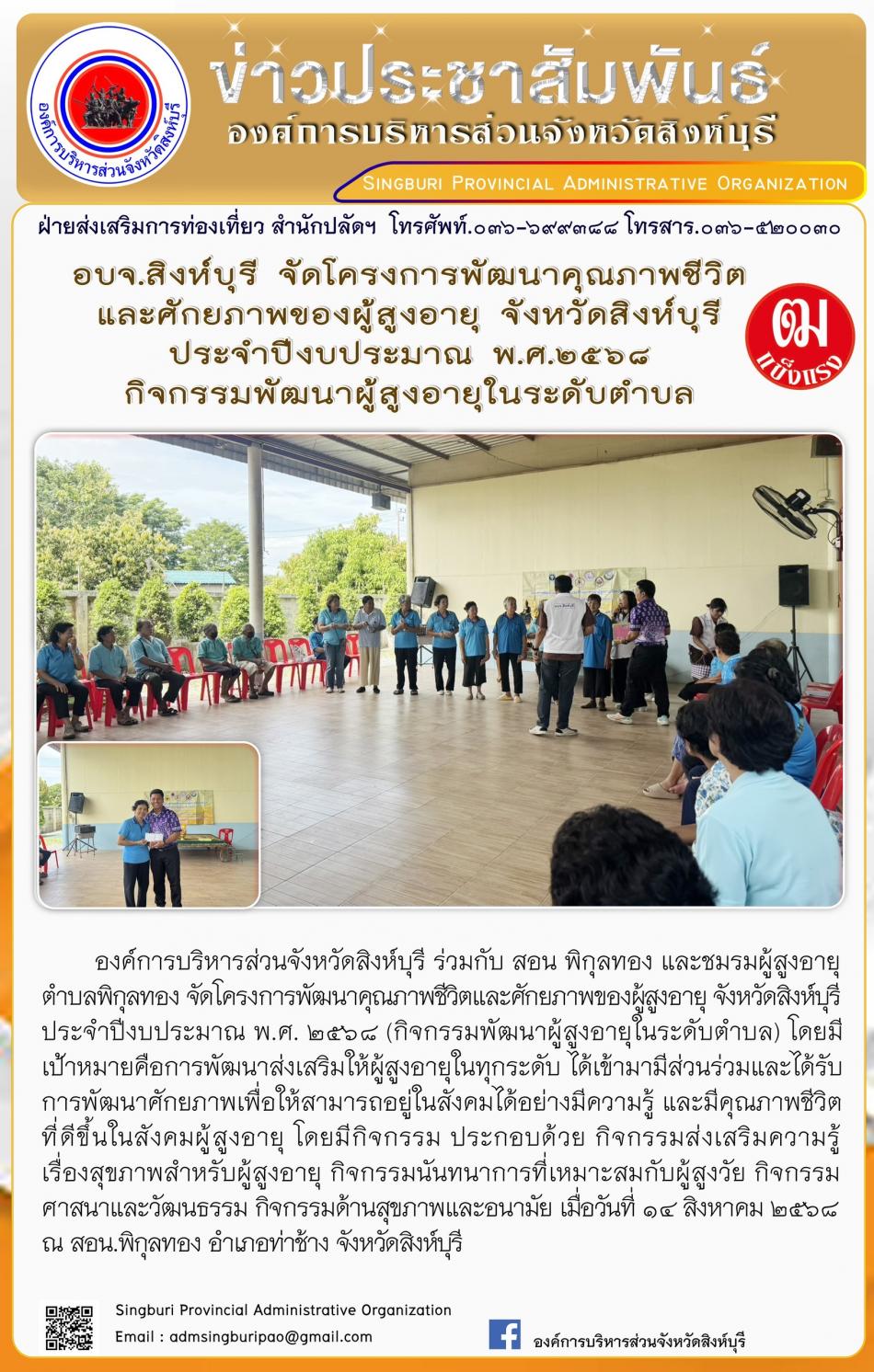 อบจ. สิงห์บุรี จัดโครงการพัฒนาคุณภาพชีวิตและศักยภาพของผู้สูงอายุ จังหวัด สิงห์บุรี ประจำประจำปีงบประมาณปี พ. ศ. 2568 กิจกรรมพัฒนาผู้สูงอายุในระดับตำบลกิจกรรมพัฒนาผู้สูงอายุในระดับตำบล [13 สิงหาคม 2568]