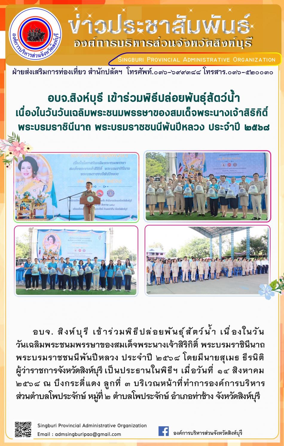 อบจ. สิงห์บุรี เข้าร่วมพิธีปล่อยพันธุ์สัตว์น้ำเข้าร่วมพิธีปล่อยพันธุ์สัตว์น้ำเนื่องในวันเฉลิมพระชนมพรรษาของสมเด็จ พระนางเจ้าสิริกิติ์พระบรมราชินีนาถพระบรมราชชนนีพันปีหลวง ประจำประจำปี 2568 [14 สิงหาคม 2568]
