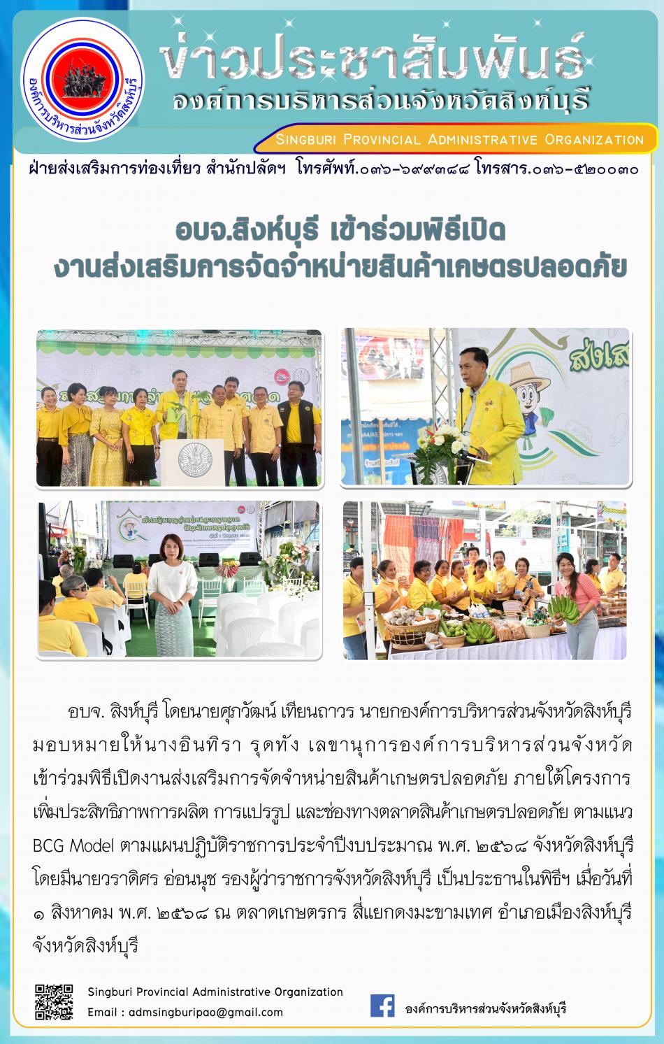 อบจ.สิงห์บุรี เข้าร่วมพิธีเปิด งานส่งเสริมการจัดจำหน่ายสินค้าเกษตรปลอดภัย [1 สิงหาคม 2568]