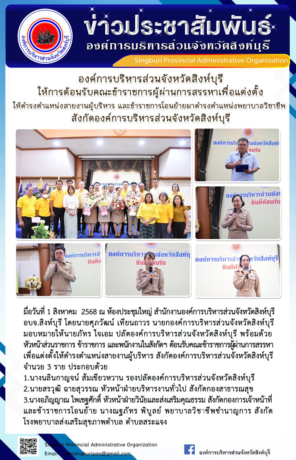 องค์การบริหารส่วนจังหวัดสิงห์บุรี ให้การต้อนรับคณะข้าราชการผู้ผ่านการสรรหาเพื่อแต่งตั้งให้ดำรงตำแหน่งสายงานผู้บริหาร และข้าราชการโอนย้ายมาดำรงตำแหน่งพยาบาลวิชาชีพ สังกัดองค์การบริหารส่วนจังหวัดสิงห์บุรี [1 สิงหาคม 2568]