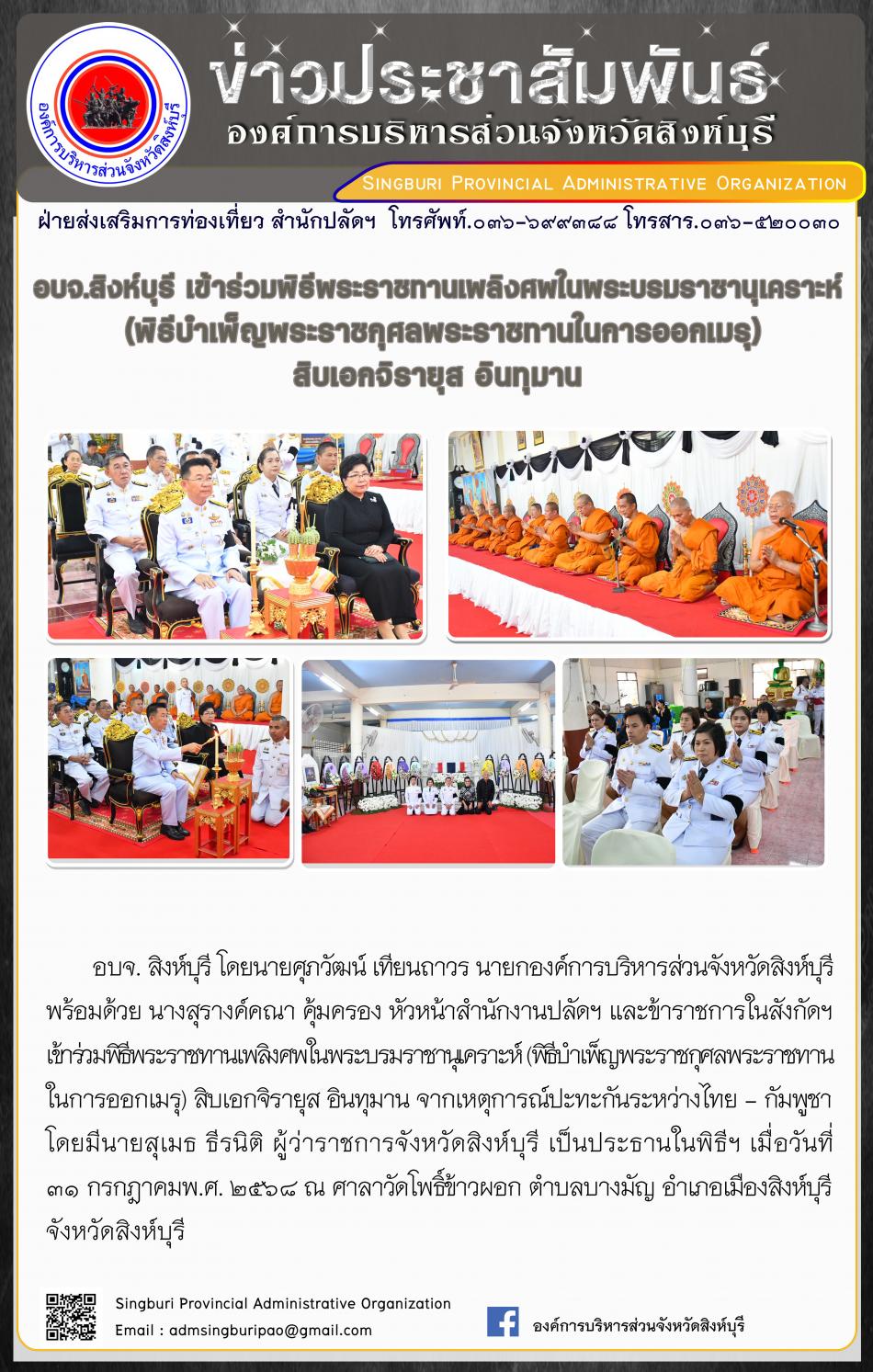อบจ.สิงห์บุรี เข้าร่วมพิธีพระราชทานเพลิงศพในพระบรมราชานุเคราะห์ (พิธีบำเพ็ญพระราชกุศลพระราชทานในการออกพระเมรุ) สิบเอกจิรายุส อินทุมาน [31 กรกฎาคม 2568]
