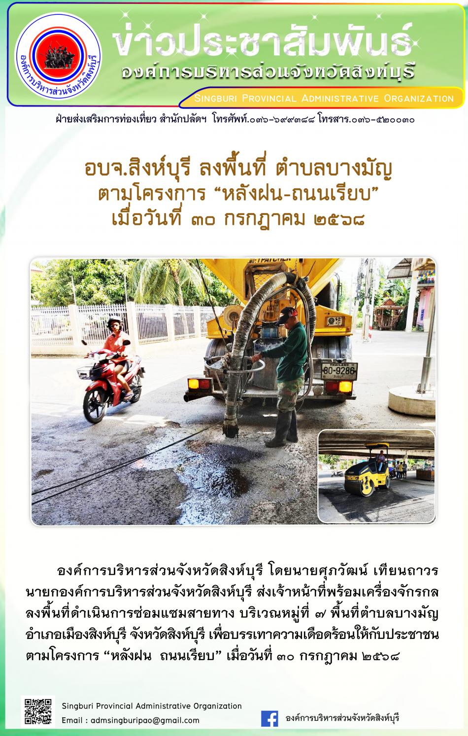 อบจ.สิงห์บุรี ลงพื้นที่ ตำบลบางมัญ ตามโครงการ "หลังฝน - ถนนเรียบ" [30 กรกฎาคม 2568]