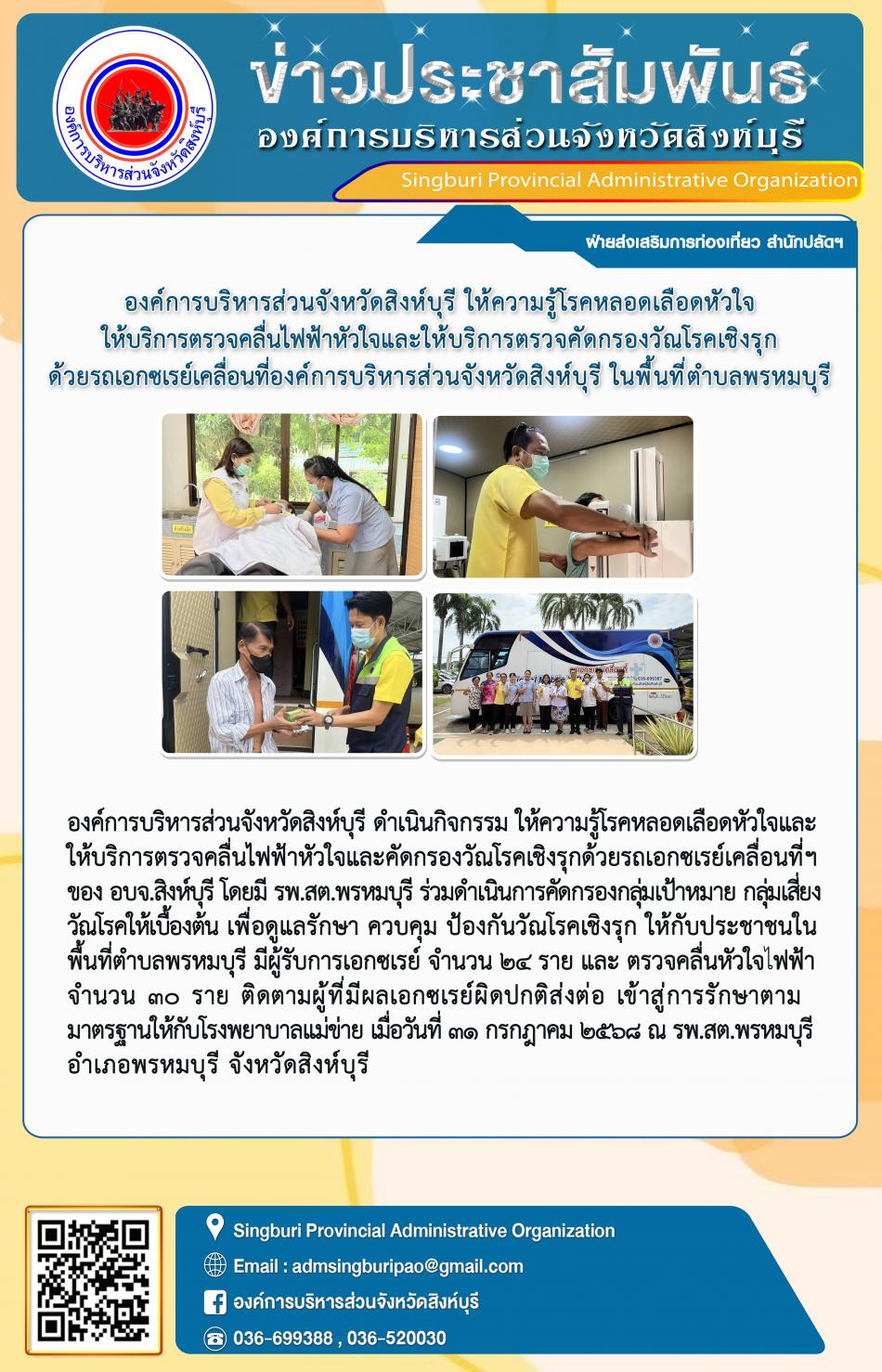 องค์การบริหารส่วนจังหวัดสิงห์บุรี ให้ความรู้โรคหลอดเลือดหัวใจและให้บริการตรวจคัดกรองวัณโรคเชิงรุกด้วยรถเอกซเรย์เคลื่อนที่องค์การบริหารส่วนจังหวัดสิงห์บุรี ในพื้นที่ตำบลพรหมบุรี [31 กรกฎาคม 2568]