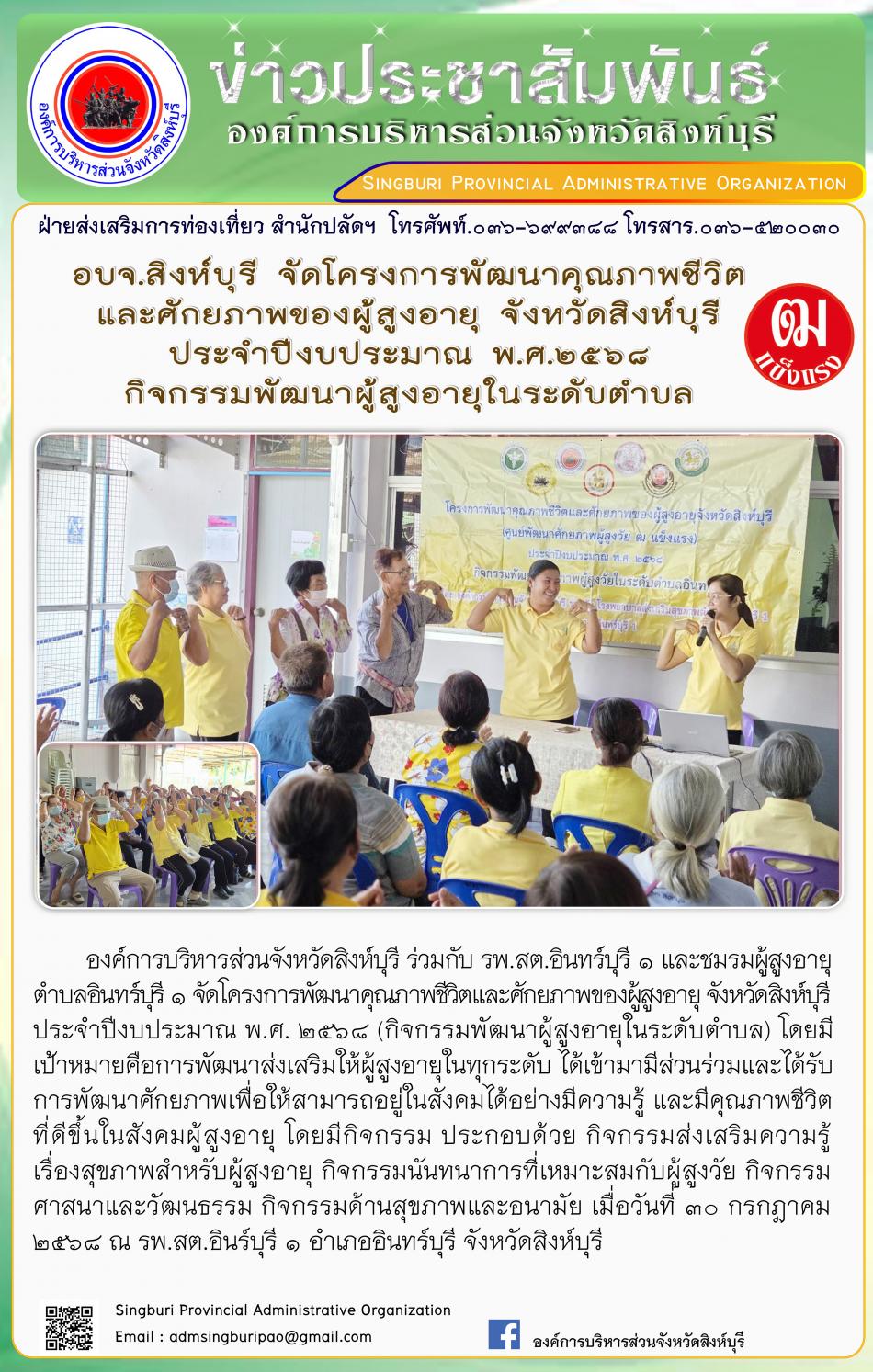 อบจ.สิงห์บุรี จัดโครงการพัฒนาคุณภาพชีวิตและศักยภาพผุ้สูงอายุจังหวัดสิงห์บุรี ประจำปีงบประมาณพ.ศ.2568 กิจกรรมพัฒนาผู้สูงอายุในระดับตำบล [30 กรกฎาคม 2568]