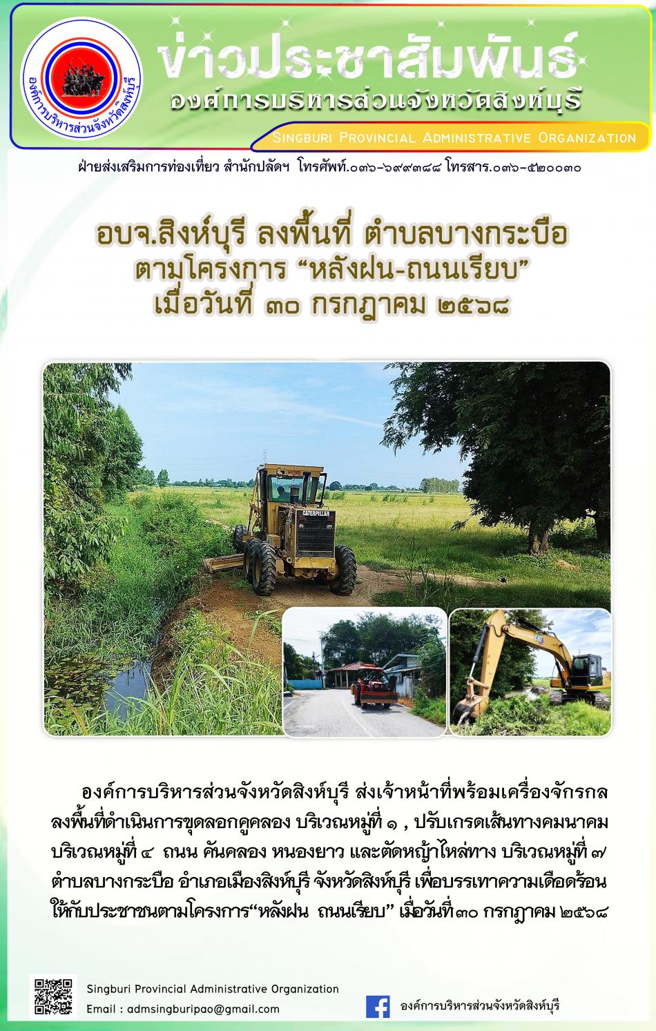 อบจ.สิงห์บุรี ลงพื้นที่ ตำบลบางกระบือ ตามโครงการ "หลังฝน - ถนนเรียบ" [30 กรกฎาคม 2568]
