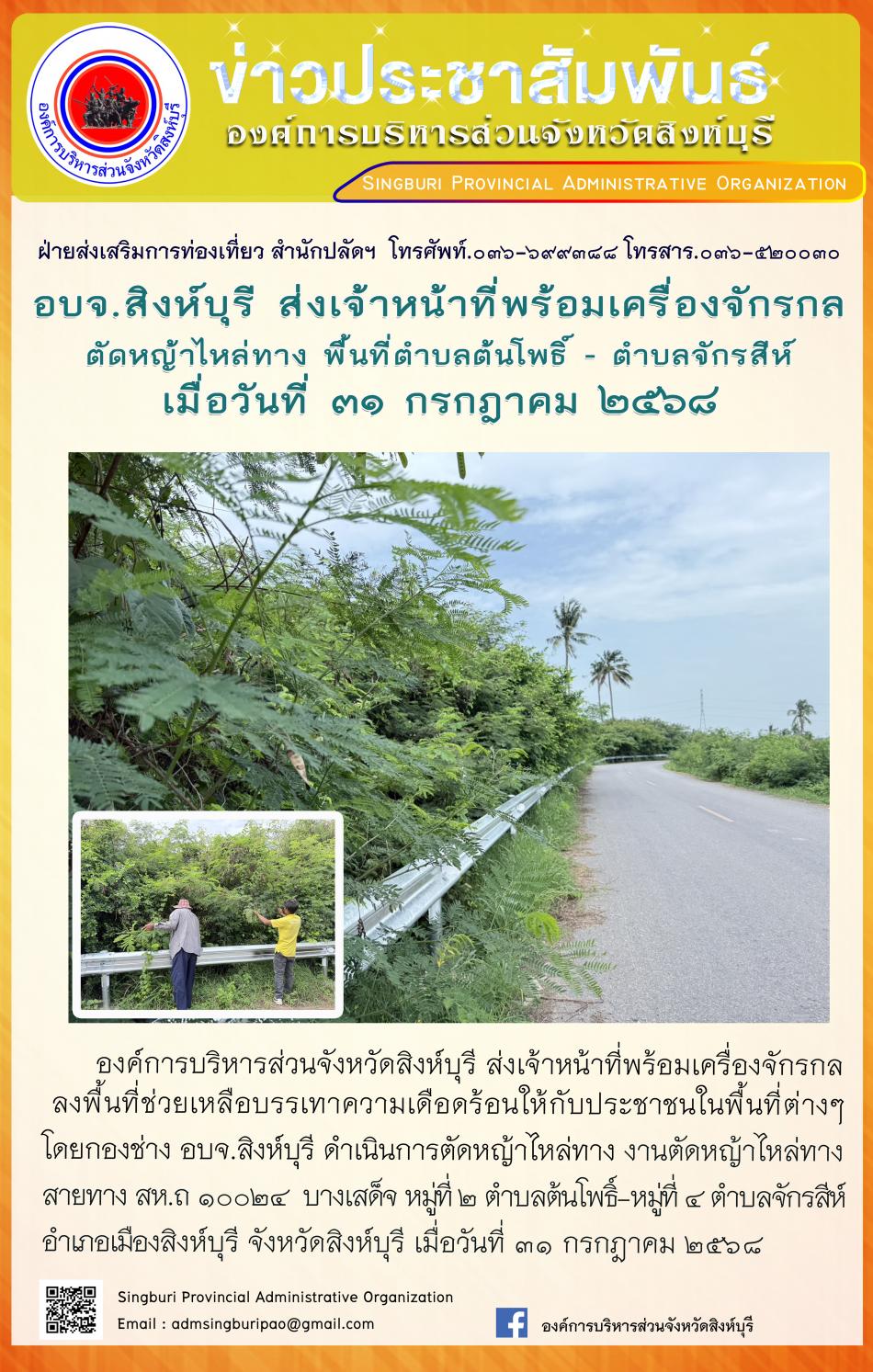 อบจ.สิงห์บุรี ส่งเจ้าหน้าที่พร้อมเครื่องจักรกล ตัดหญ้าไหล่ทาง พื้นที่ตำบลจักรสีห์ - ตำบลต้นโพธิ์ [31 กรกฎาคม 2568]