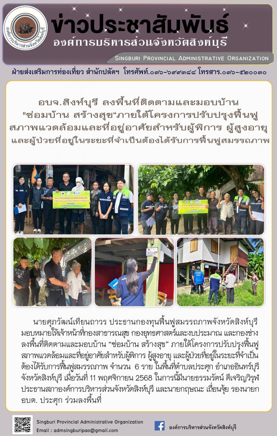 อบจ.สิงห์บุรี ลงพื้นที่ติดตามและมอบบ้าน "ซ่อมบ้าน สร้างสุข" ภายใต้โครงการปรับปรุงฟื้นฟูสภาพแวดล้อมและที่อยู่อาศัยสำหรับผู้พิการผู้สูงอายุ และผู้ป่วยที่อยู่ในระยะที่จำเป็นต้องได้รับการฟื้นฟูสมรรถภาพ [11 พฤศจิกายน 2568]