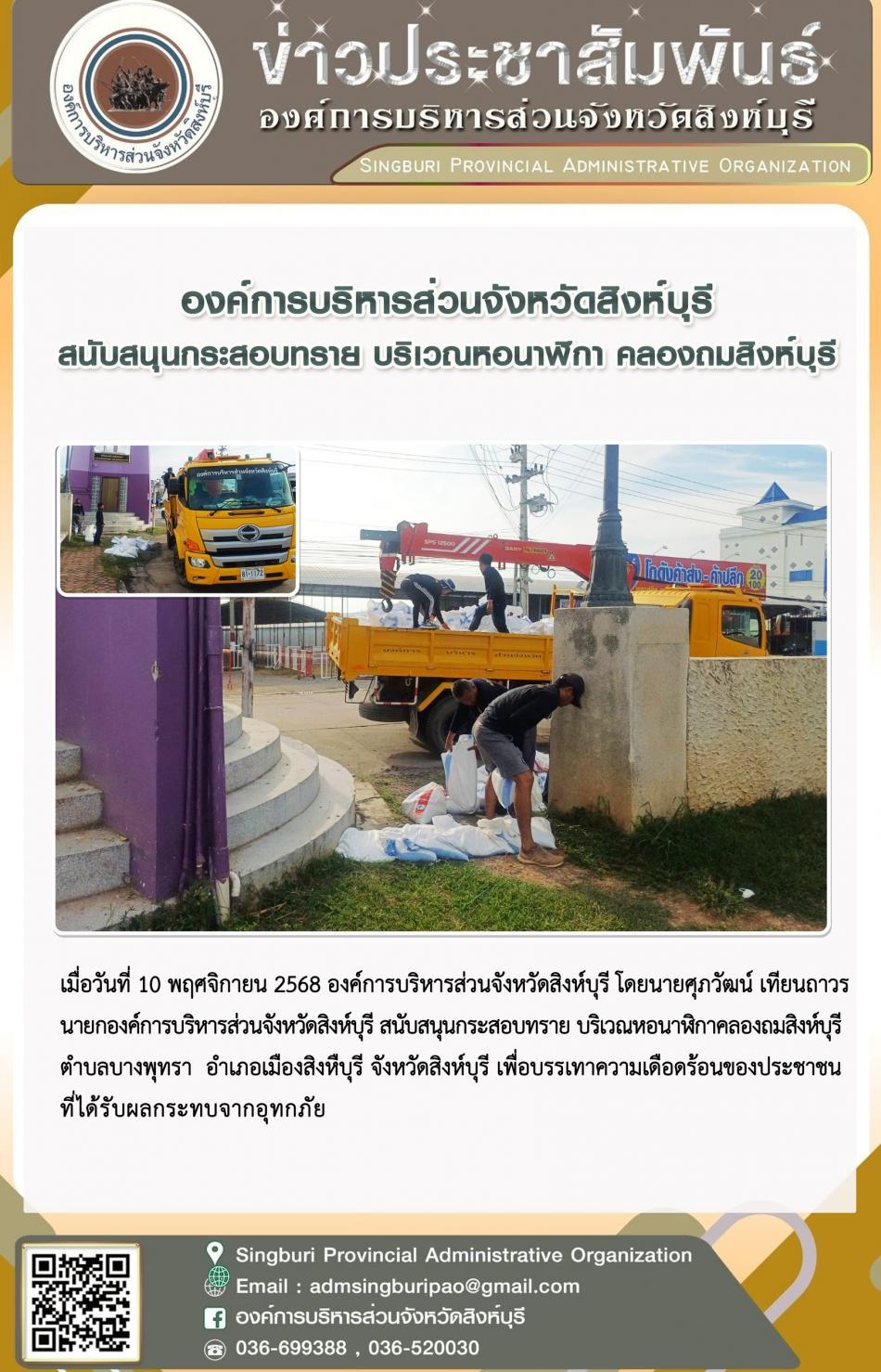 องค์การบริหารส่วนจังหวัดสิงห์บุรี สนับสนุนกระสอบทราย บริเวณหอนาฬิกา คลองถมสิงห์บุรี [10 พฤศจิกายน 2568]