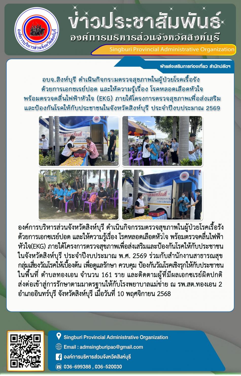 อบจ.สิงห์บุรี ดำเนินกิจกรรมตรวจสุขภาพในผู้ป่วยโรคเรื้อรังด้วยการเอกซเรย์ปอดและให้ความรู้เรื่องโรคหลอด เลือดหัวใจพร้อมตรวจคลื่นไฟฟ้าหัวใจ ( EKG)... [10 พฤศจิกายน 2568]