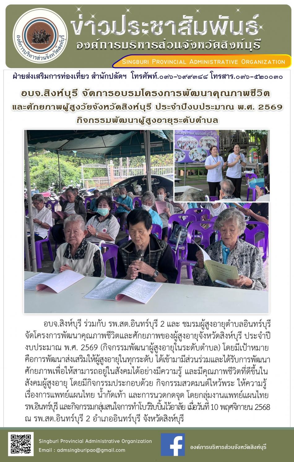 อบจ. สิงห์บุรี จัดโครงการพัฒนาคุณภาพชีวิตและศักยภาพของผู้สูงอายุ จังหวัด สิงห์บุรี ประจำประจำปีงบประมาณปี พ. ศ. 2569 กิจกรรมพัฒนาผู้สูงอายุในระดับตำบลกิจกรรมพัฒนาผู้สูงอายุในระดับตำบล [10 พฤศจิกายน 2568]