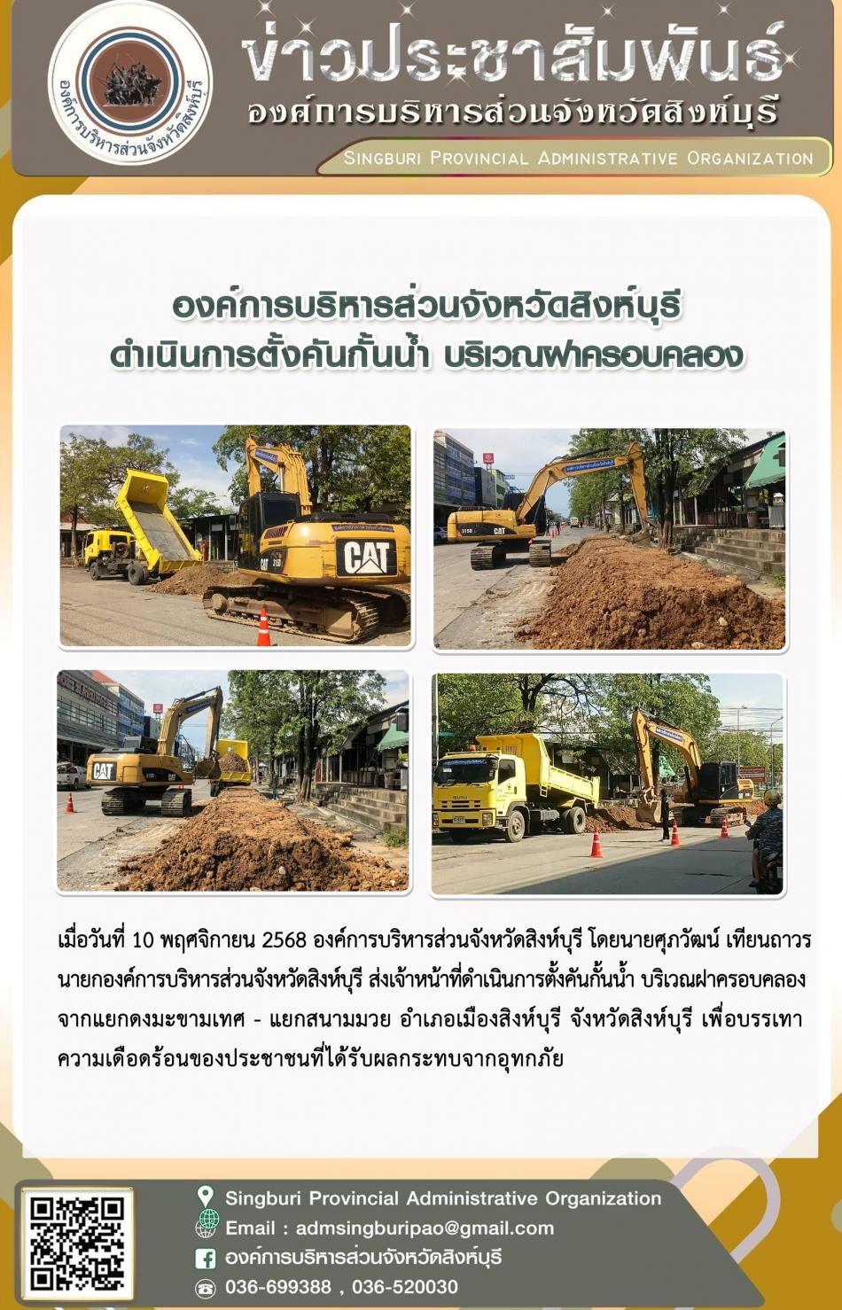 องค์การบริการส่วนจังหวัดสิงห์บุรี ดำเนินการตั้งคันกันน้ำ บริเวณฝาครอบคลอง [10 พฤศจิกายน 2568]