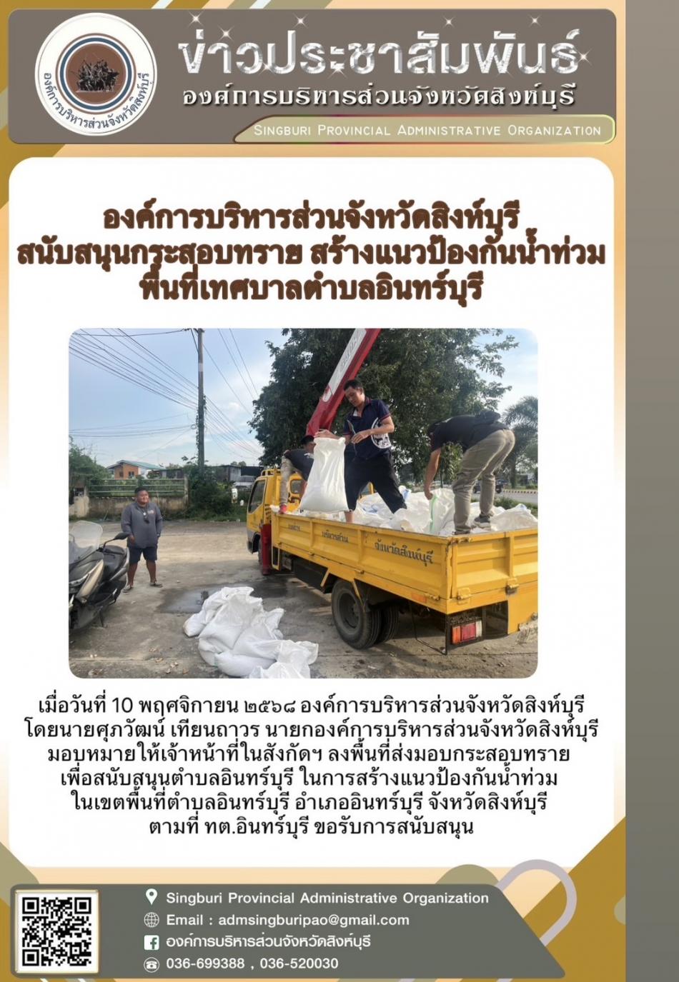 องค์การบริหารส่วนจังหวัดสิงห์บุรี สนับสนุนกระสอบทราย สร้างแนวป้องกันน้ำท่วม พื้นที่เทศบาลตำบลอินทร์บุรี [10 พฤศจิกายน 2568]