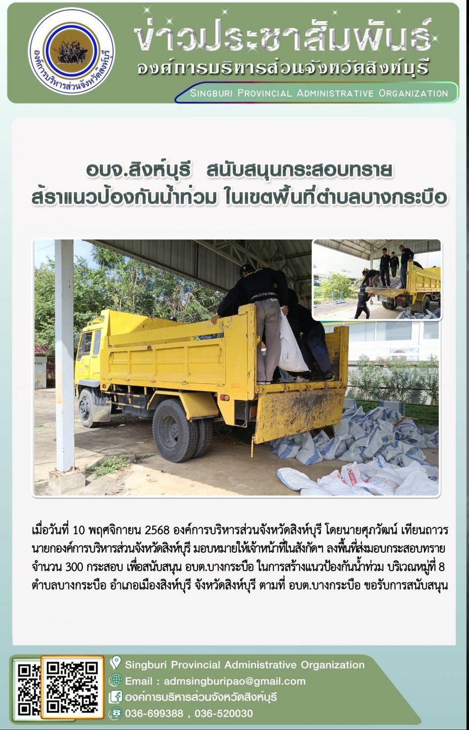 อบจ.สิงห์บุรี สนับสนุนกระสอบทรายสร้างแนวป้องกินน้ำท่วม ในเขตพื้นที่ตำบลบางกระบือ [10 พฤศจิกายน 2568]