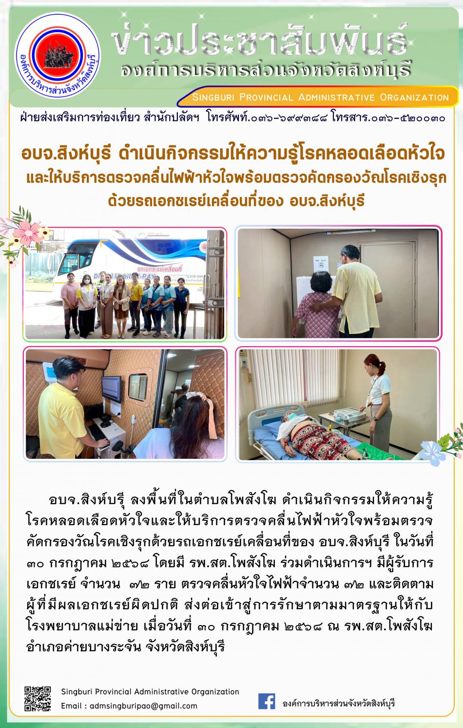 อบจ.สิงห์บุรี ดำเนินกิจกรรมให้ความรู้โรคหลอดเลือดหัวใจและให้บริการตรวจคลื่นไฟฟ้าหัวใจพร้อมตรวจคัดกรองวัณโรคเชิงรุกด้วยรถเอกซเรย์เคลื่อนที่ของ อบจ.สิงห์บุรี [30 กรกฎาคม 2568]