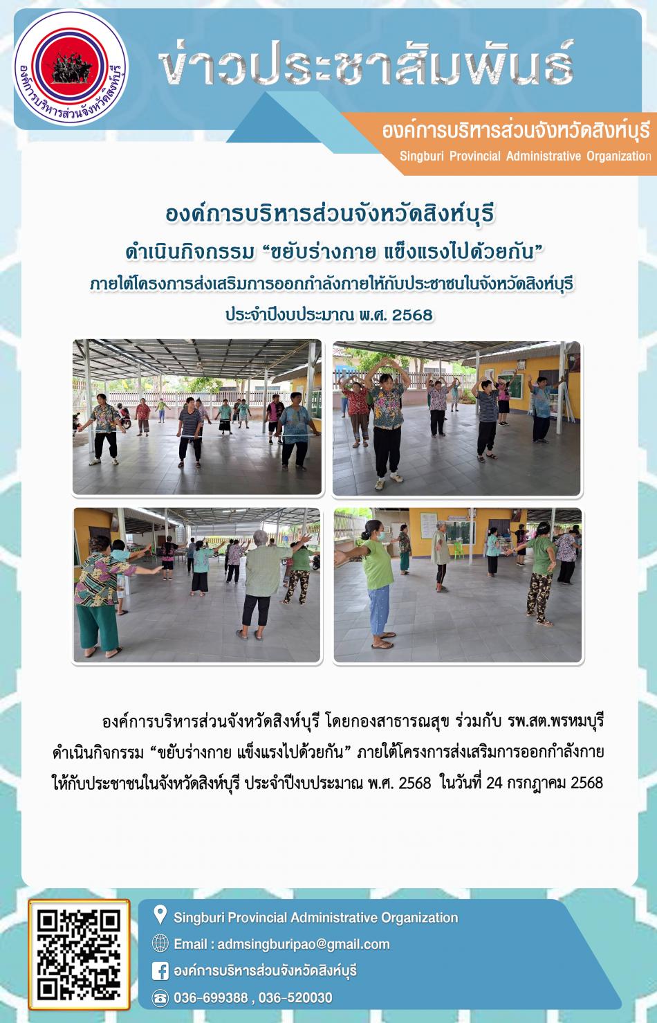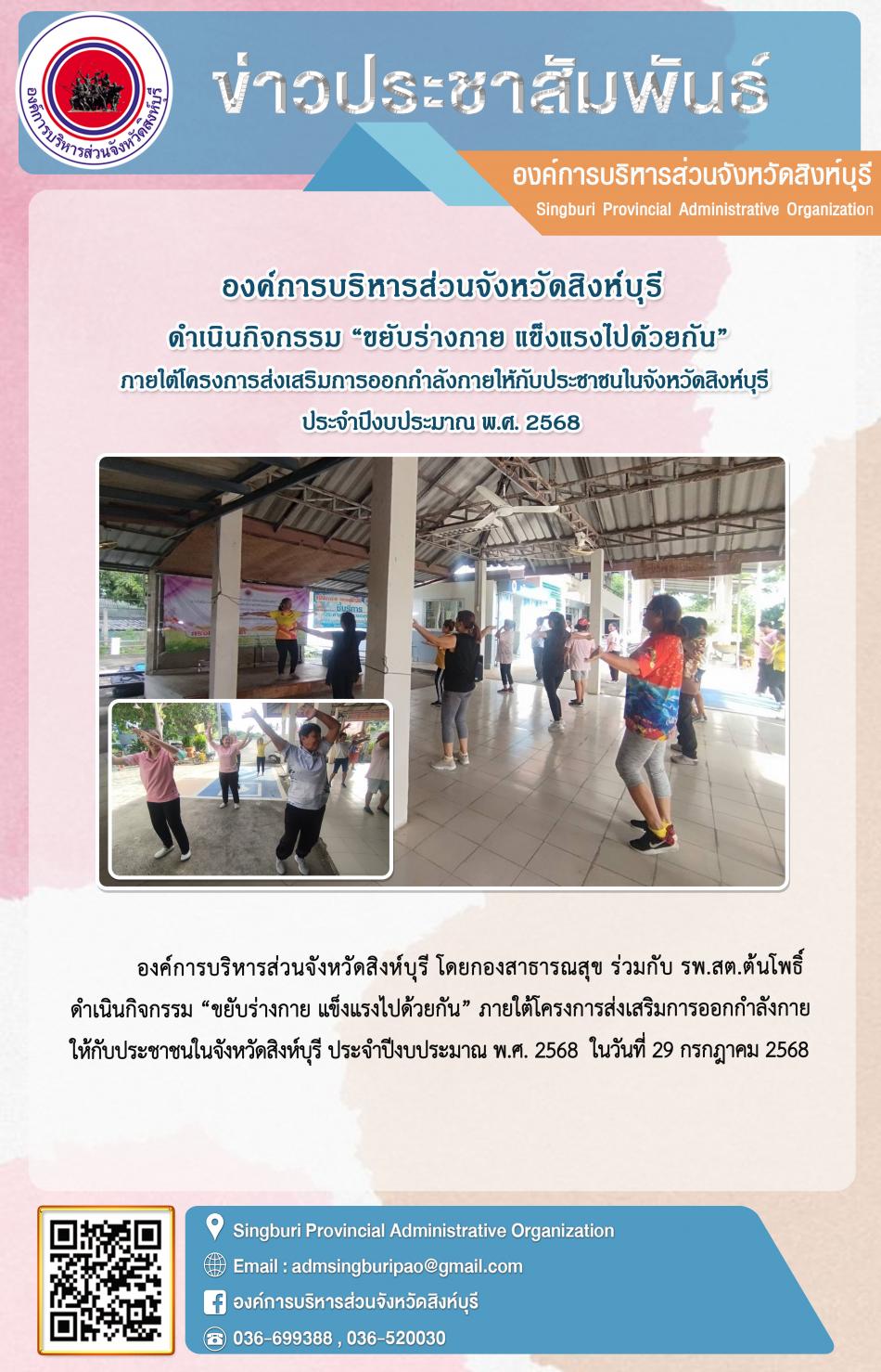 องค์การบริหารส่วนจังหวัดสิงห์บุรี ดำเนินกิจกรรม "ขยับร่างกาย แข็งแรงไปด้วยกัน " ภายใต้โครงการส่งเสริมการออกกำลังกายให้กับประชาชนในจังหวัดสิงห์บุรี ประจำปีงบประมาณ พ.ศ.2568 [29 กรกฎาคม 2568]
