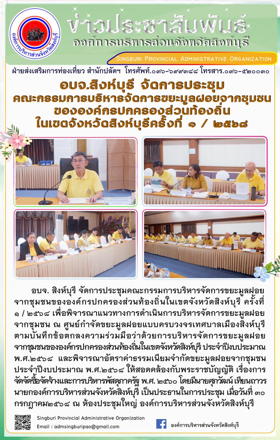 อบจ.สิงห์บุรี จัดการประชุมคณะกรรมการบริหารจัดการขยะมูลฝอยจากชุมชนขององค์กรปกครองส่วนท้องถิ่น ในเขตจังหวัดสิงหืบุรี ครั้งที่ 1/2568 [30 กรกฎาคม 2568]