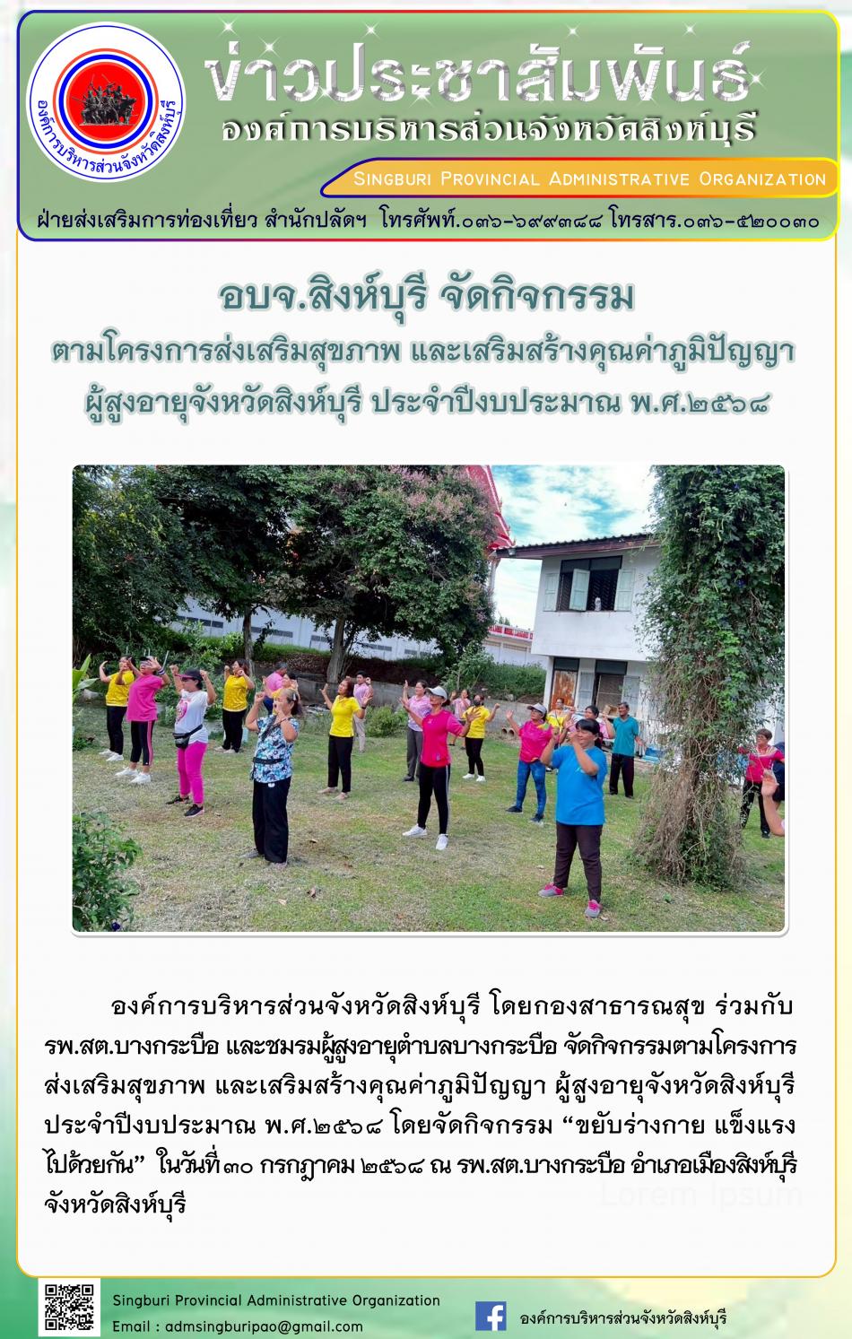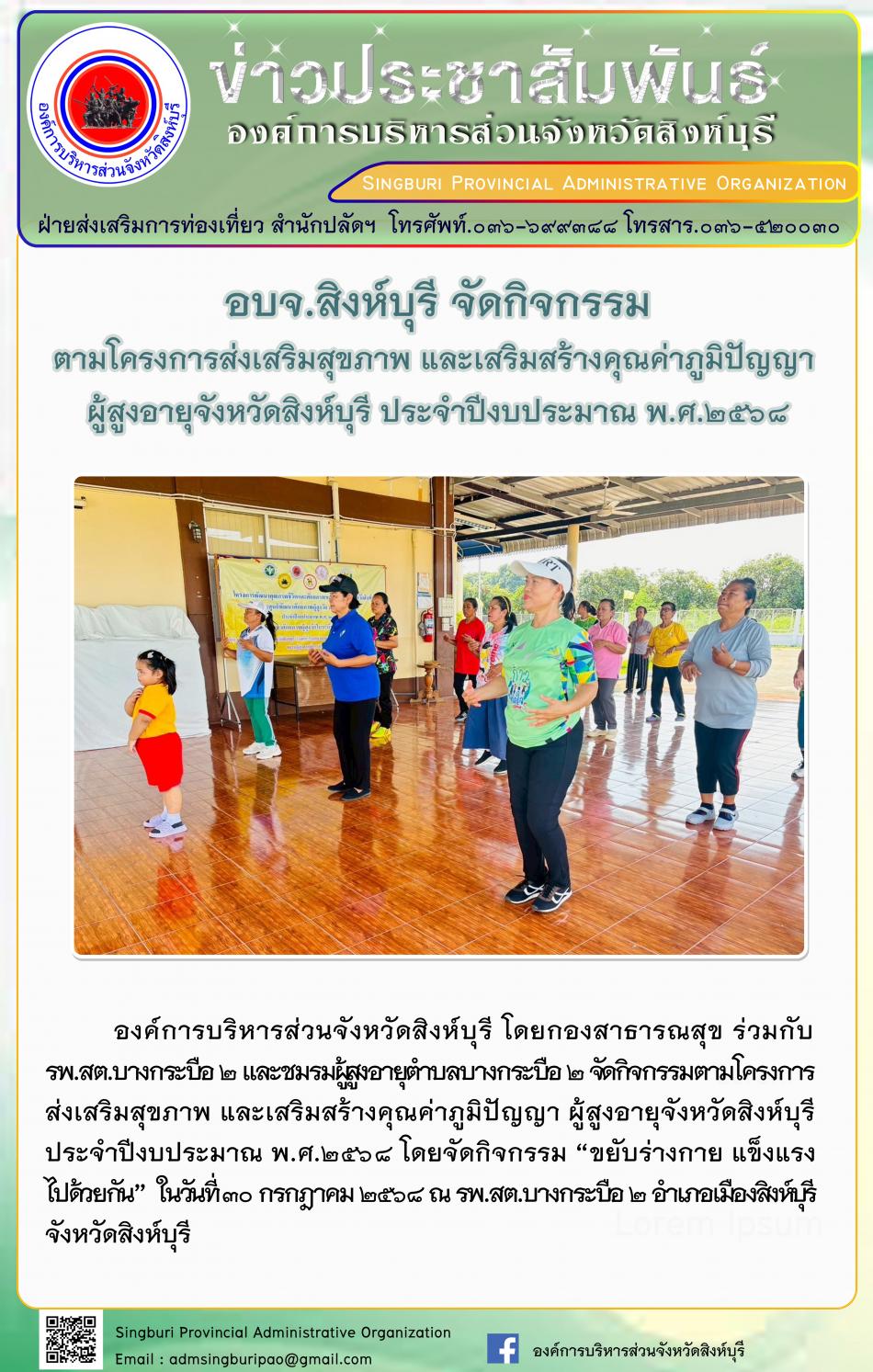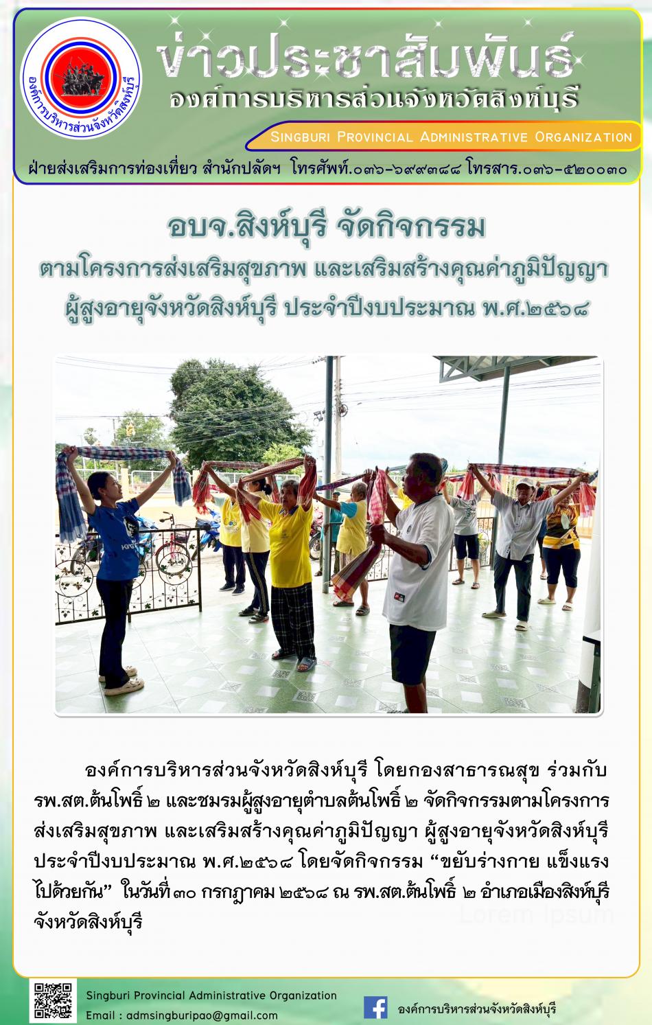 อบจ.สิงห์บุรี จัดกิจกรรมตามโครงการส่งเสริมสุขภาพ และเสริมสร้างคุณค่าภูมิปัญญาผู้สูงอายุจังหวัดสิงห์บุรี ประจำปีงบประมาณ พ.ศ.2568 [30 กรกฎาคม 2568]