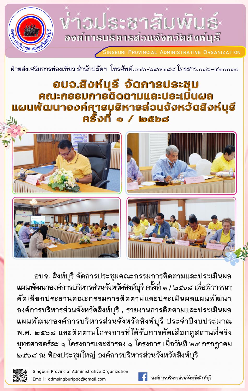 อบจ.สิงห์บุรี จัดการประชุมคณะกรรมการติดตามและประเมินผล แผนพัฒนาองค์การบริหารส่วนจังหวัดสิงห์บุรี ครั้งที่ 1/2568 [29 กรกฎาคม 2568]