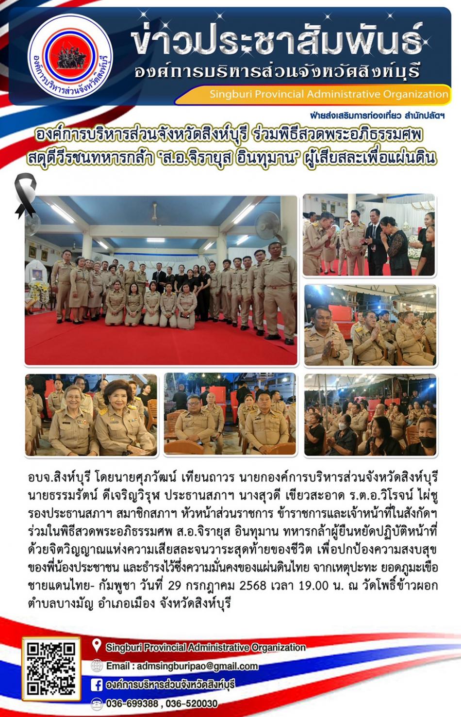 องค์การบริหารส่วนจังหวัดสิงห์บุรี ร่วมพิธีสวดพระอภิธรรมศพ สดุดีวีรชนทหารกล้า "ส.อ.จิรายุส อินทุมาน"ผู้เสียนสละเพื่อแผ่นดิน [29 กรกฎาคม 2568]