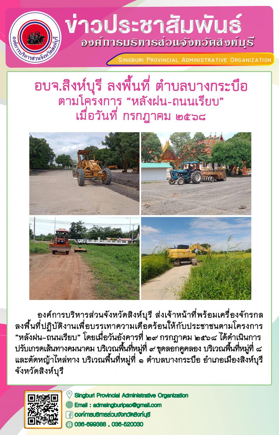 อบจ.สิงห์บุรี ลงพื้นที่ ตำบลบางกระบือ ตามโครงการ "หลังฝน - ถนนเรียบ" [29 กรกฎาคม 2568]