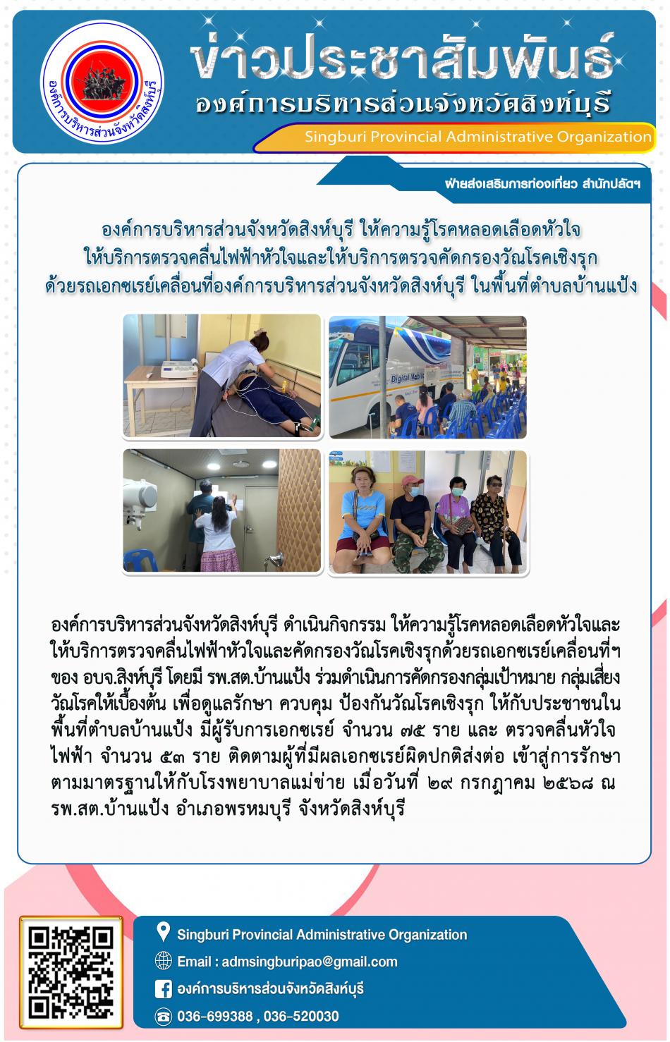 องค์การบริหารส่วนจังหวัดสิงห์บุรี ให้ความรู้โรคหลอดเลือดหัวใจและให้บริการตรวจคัดกรองวัณโรคเชิงรุกด้วยรถเอกซเรย์เคลื่อนที่องค์การบริหารส่วนจังหวัดสิงห์บุรี ในพื้นที่ตำบล บ้านแป้ง [29 กรกฎาคม 2568]
