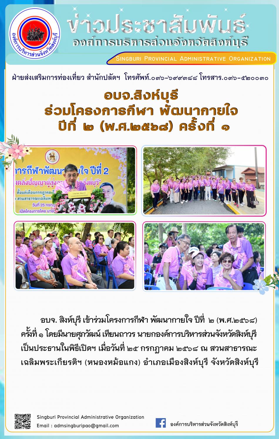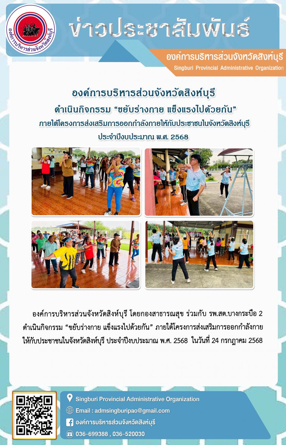 องค์การบริหารส่วนจังหวัดสิงห์บุรี ดำเนินกิจกรรม "ขยับร่างกาย แข็งแรงไปด้วยกัน " ภายใต้โครงการส่งเสริมการออกกำลังกายให้กับประชาชนในจังหวัดสิงห์บุรี ประจำปีงบประมาณ พ.ศ.2568 [24 กรกฎาคม 2568]
